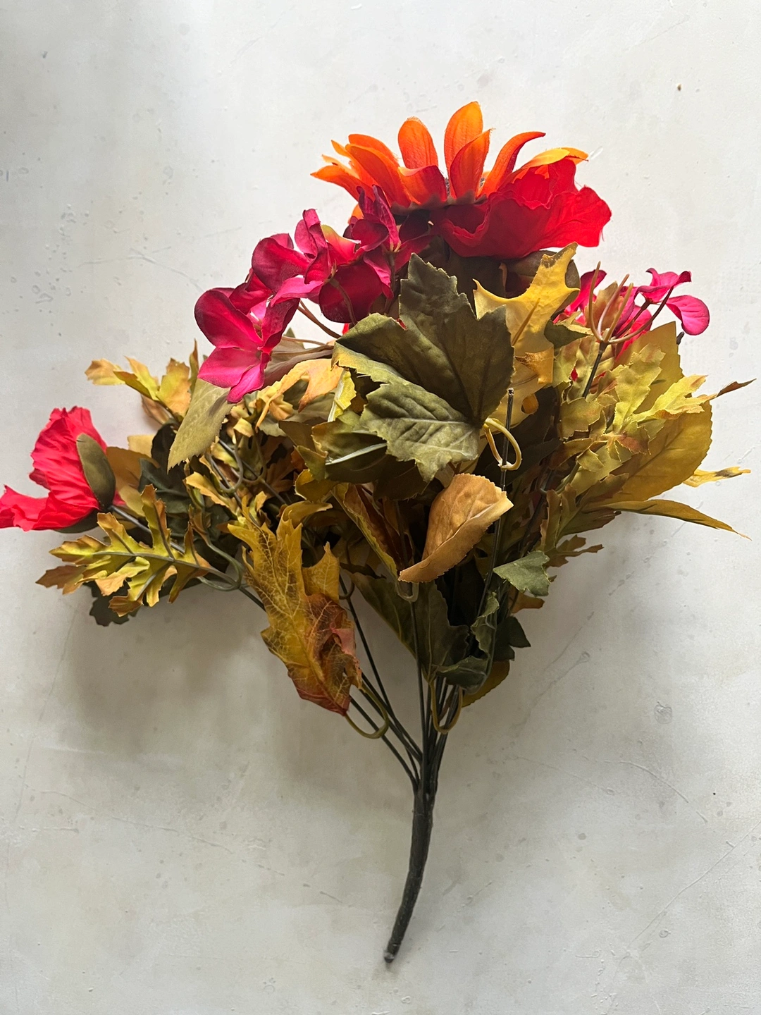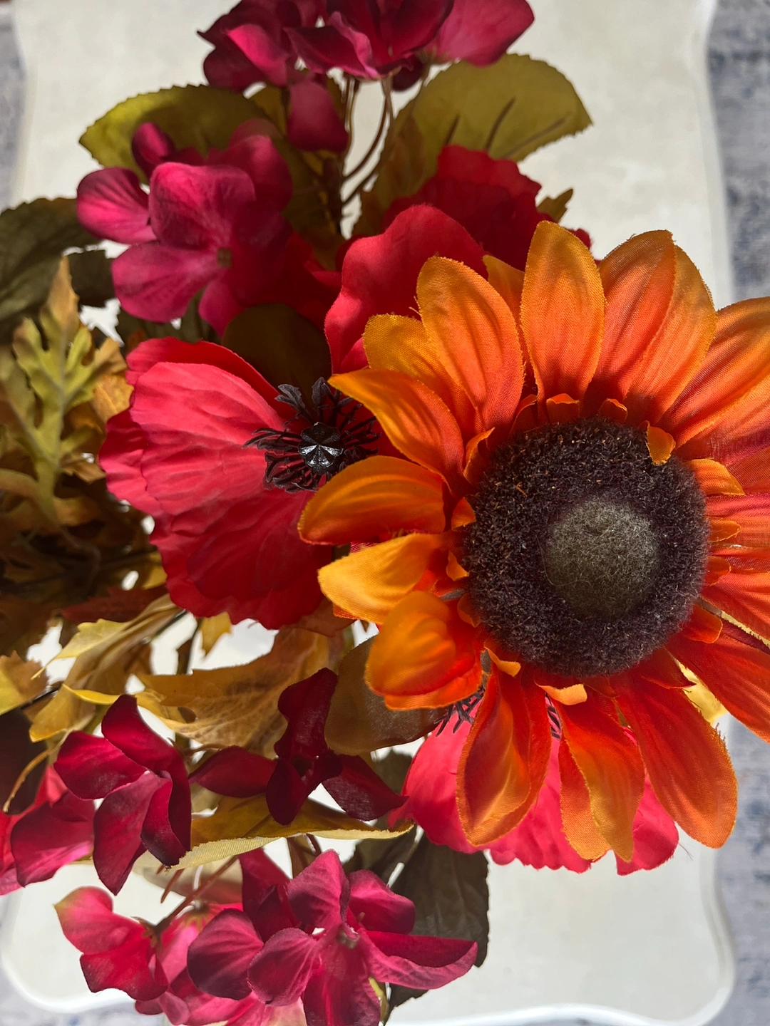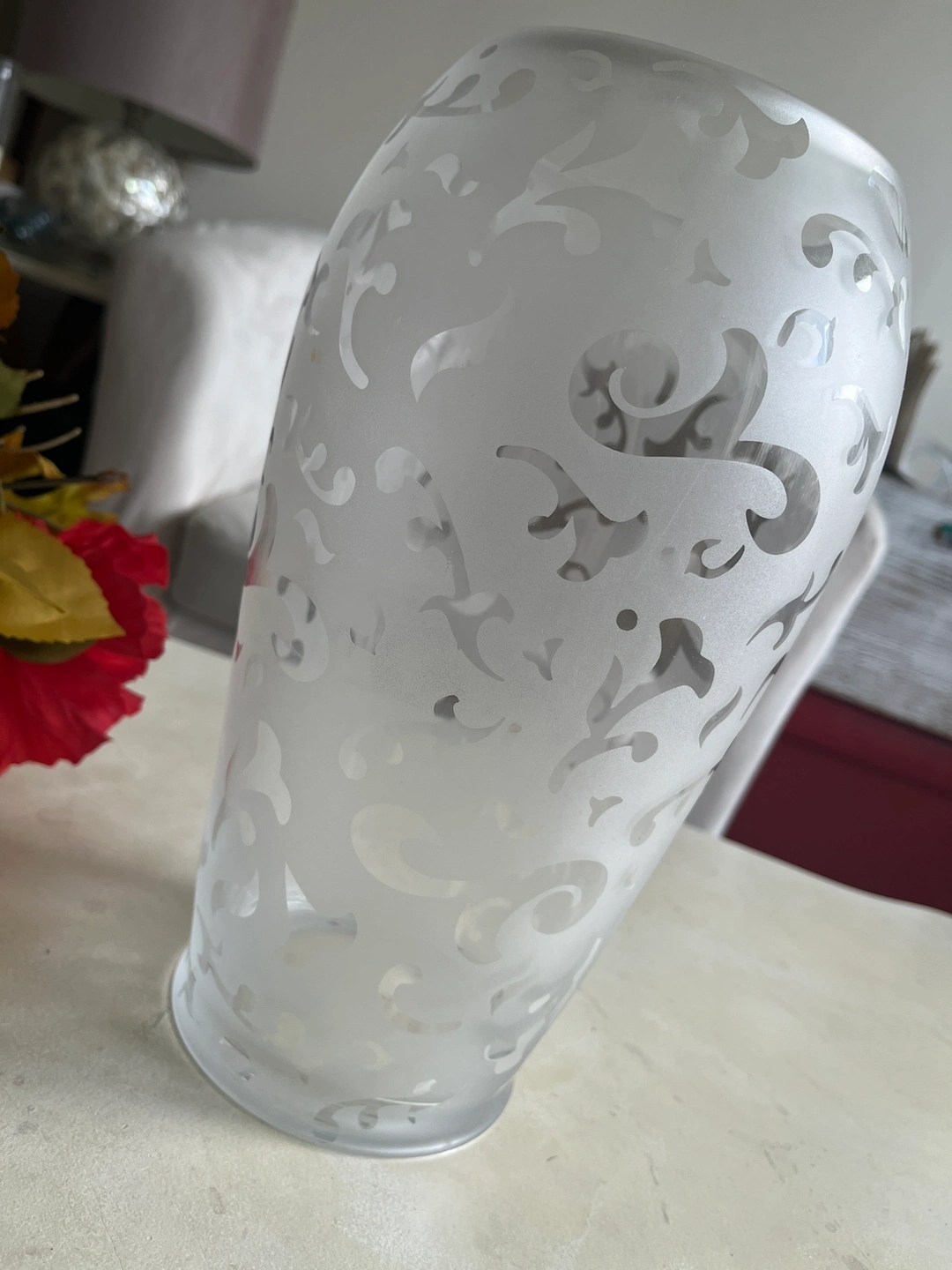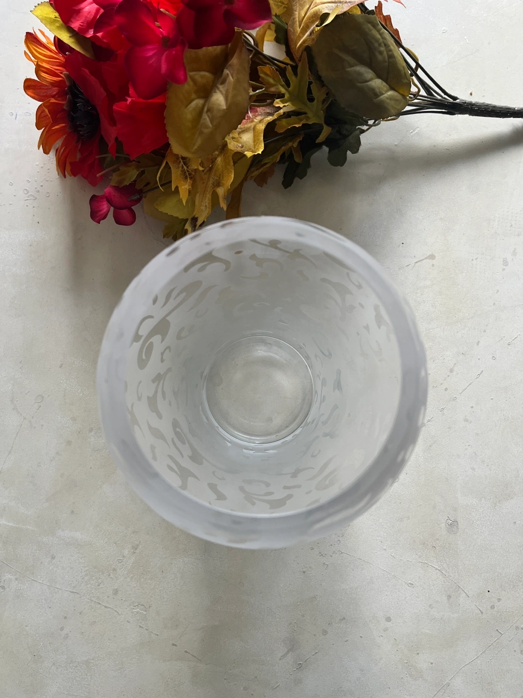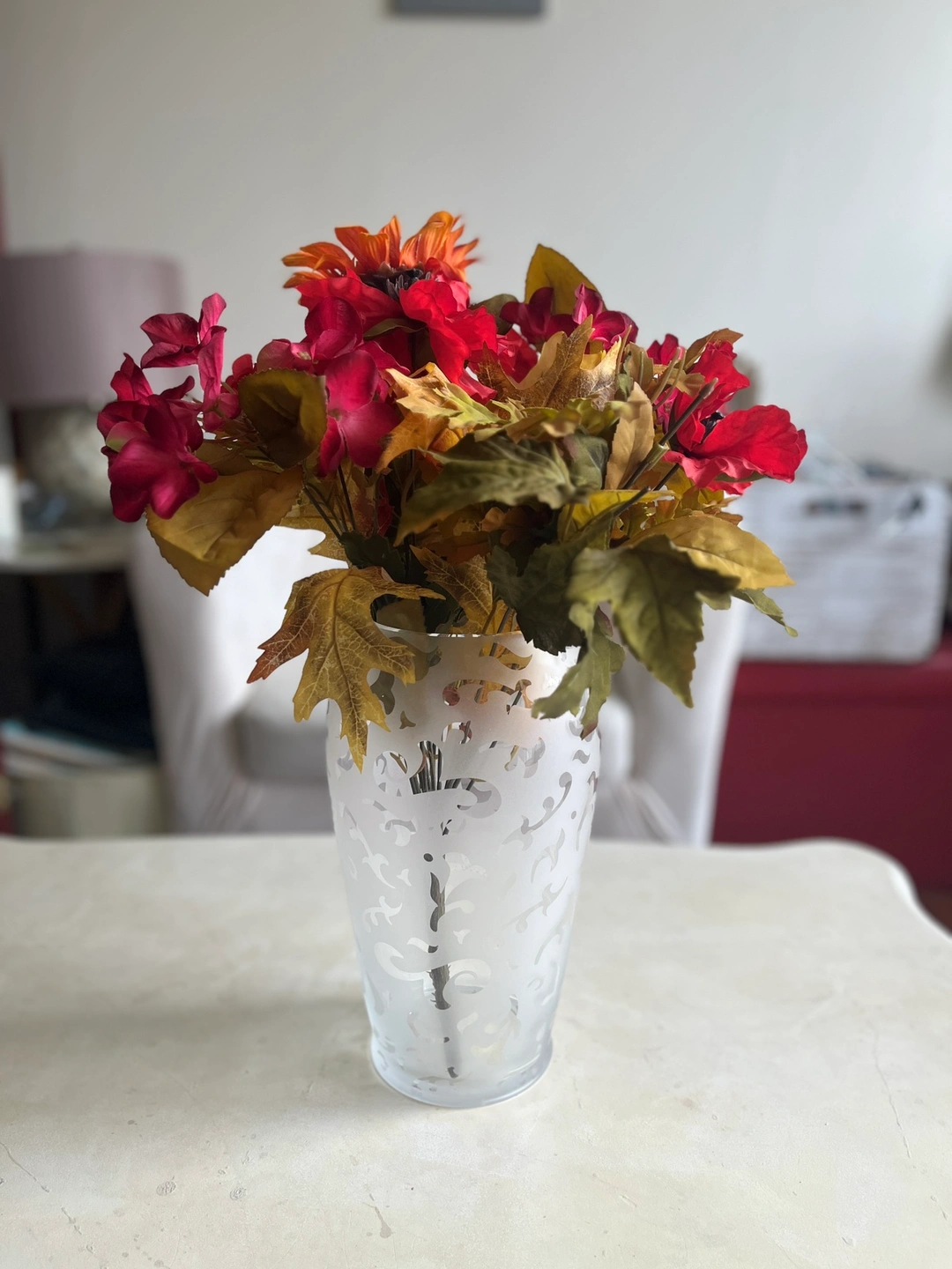 Frosted glass vase. Includes an arrangement of faux fall flowers.