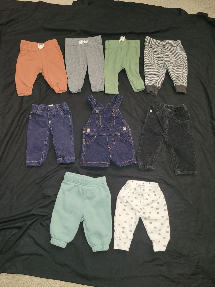 Bundle of baby pants in various colours and styles. all pieces are Carter's Brand except the bottom 2 (George and Gem Looks). 8 pants and 1 short overalls. gender neutral