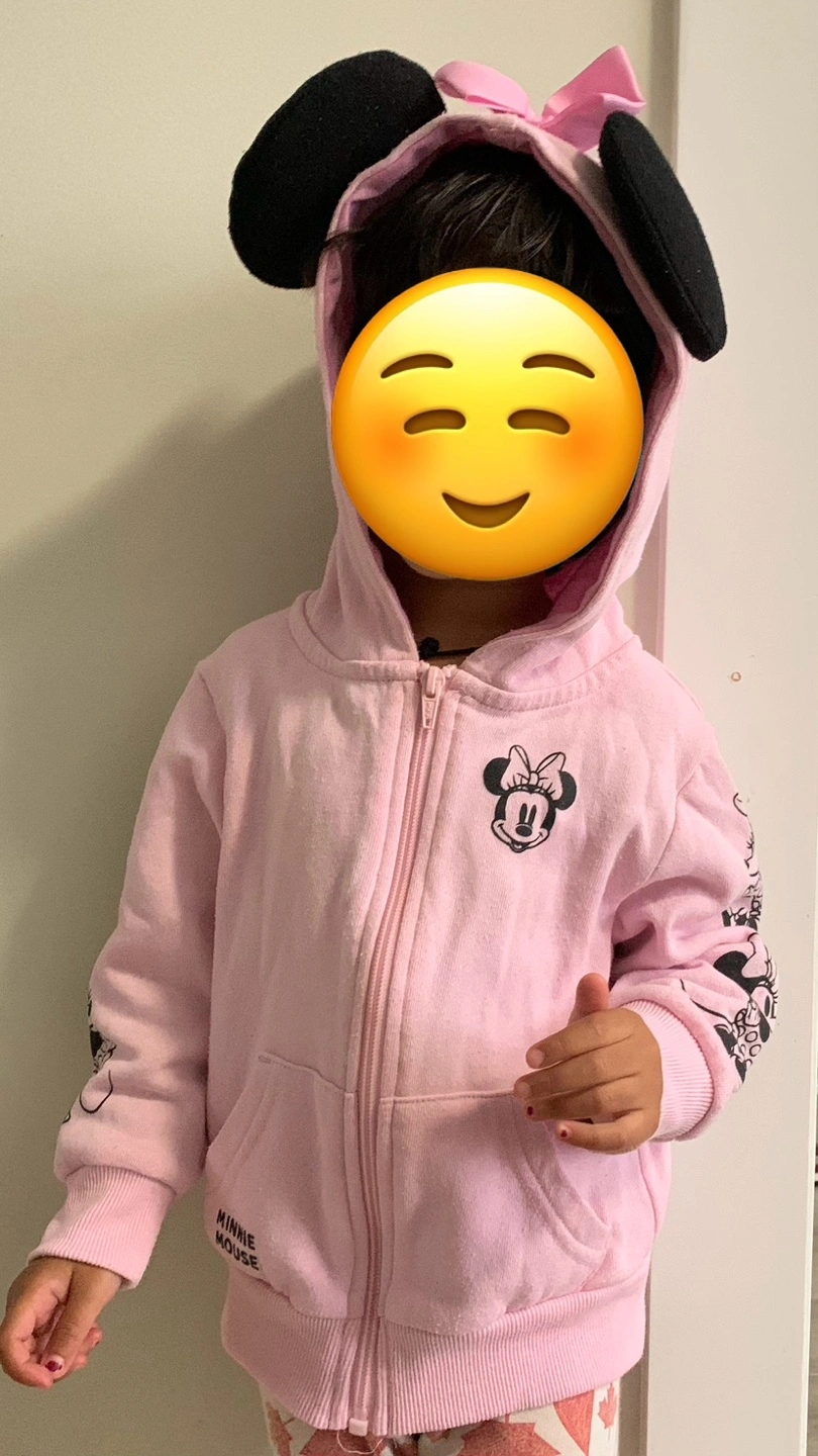 121By Disney: Pink zip up hoodie with Minnie Mouse ears and a bow. The hoodie is covered in Minnie Mouse images.