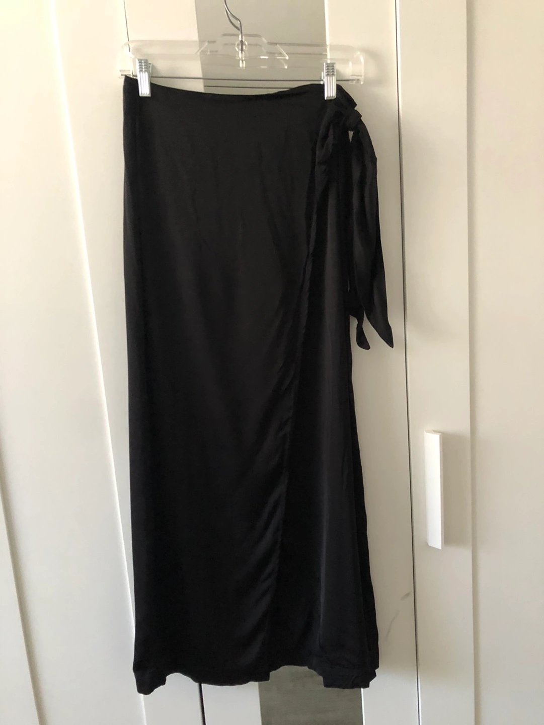 Black satin wrap skirt and a tie at the waist. Please note there is an additional slit in the back (there will be a side slit from the style being a wrap dress). Also a small pocket on the back right side.