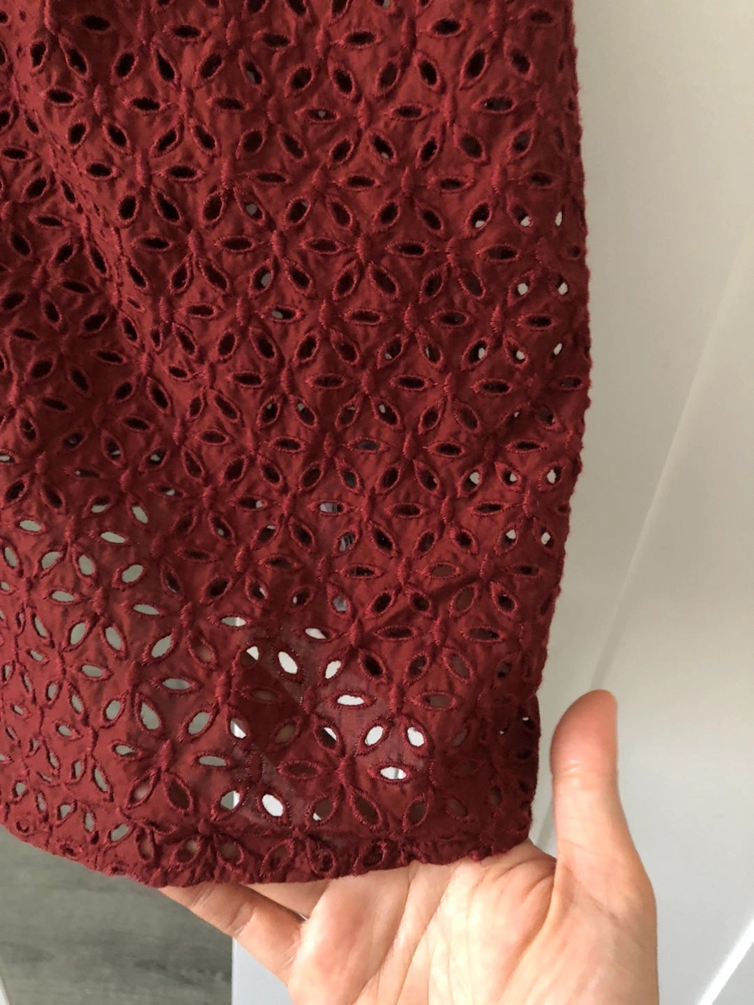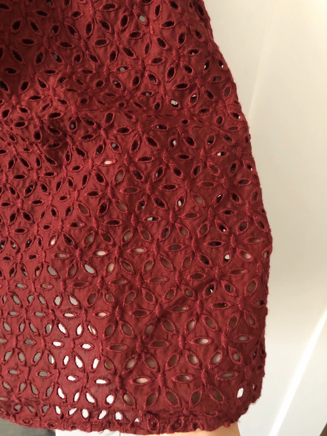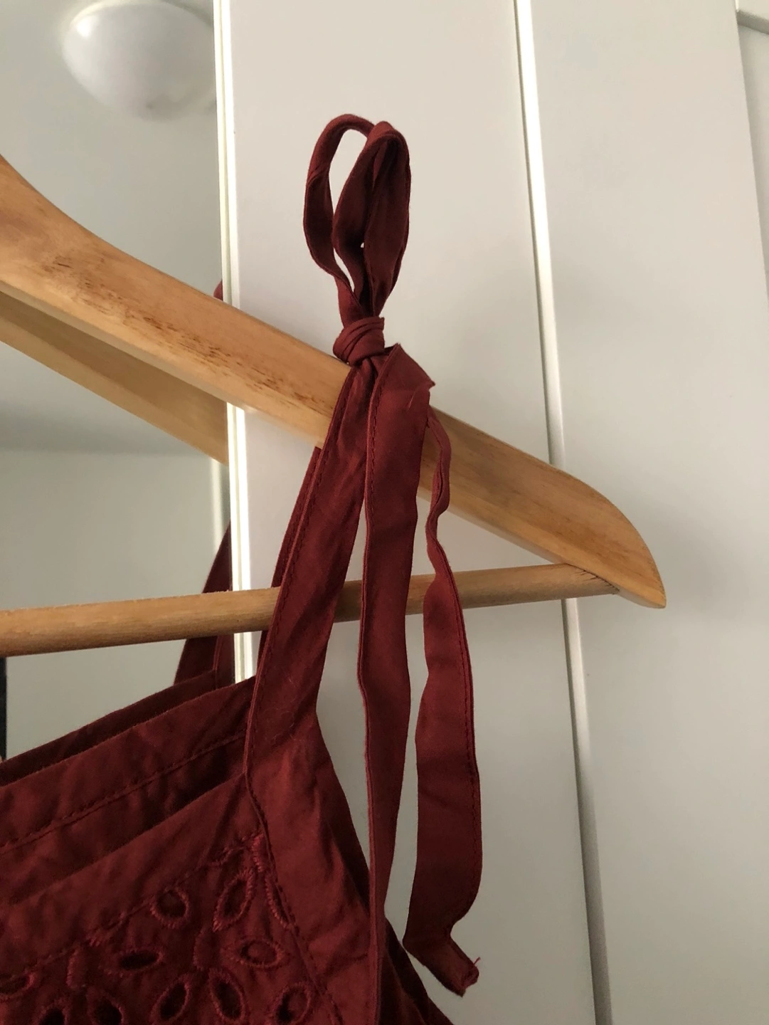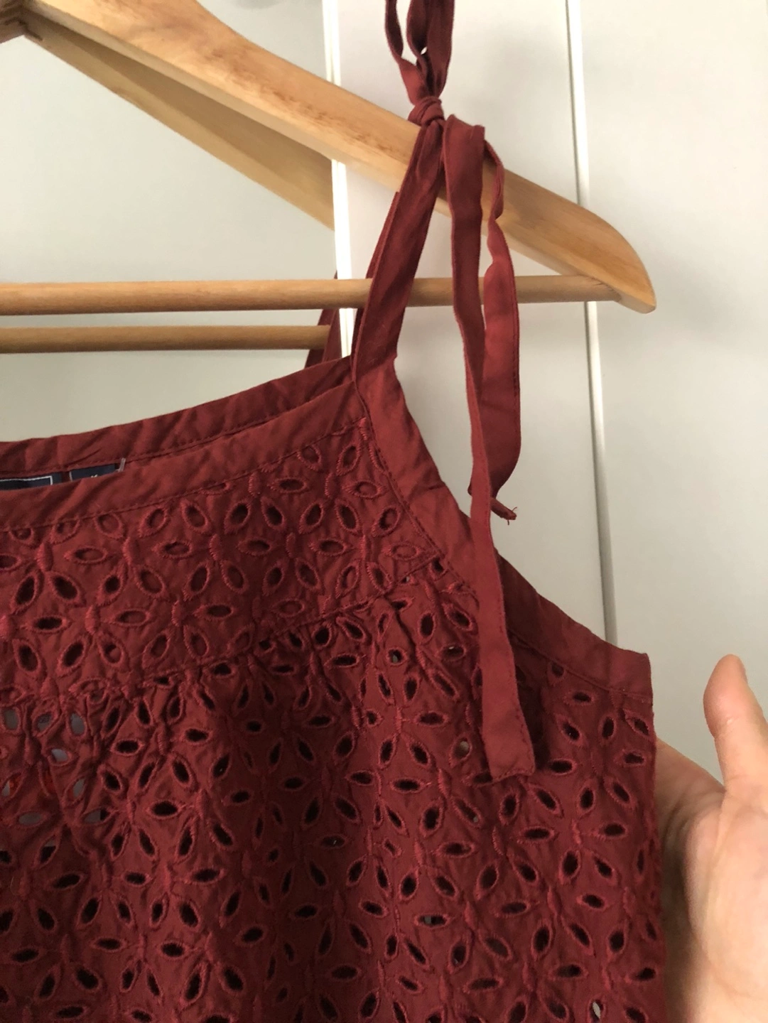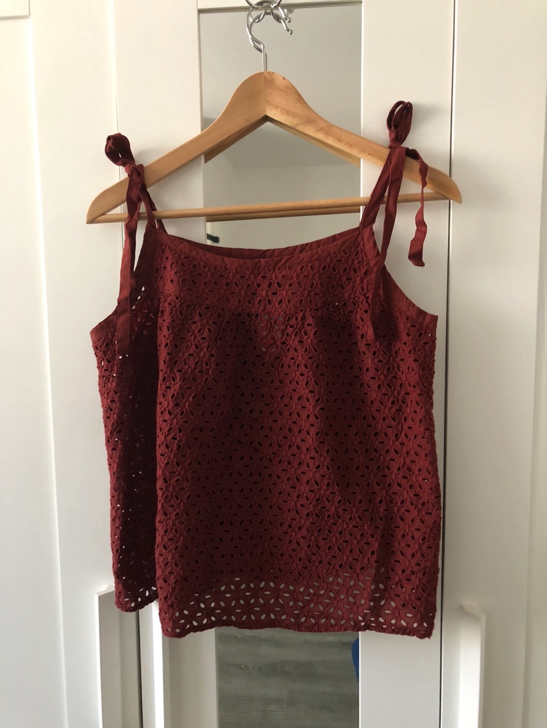 Red tank top with eyelet detail, adjustable tie straps. There is no under layer so the eyelet holes make it see through. Very cute! Brand new with tags.