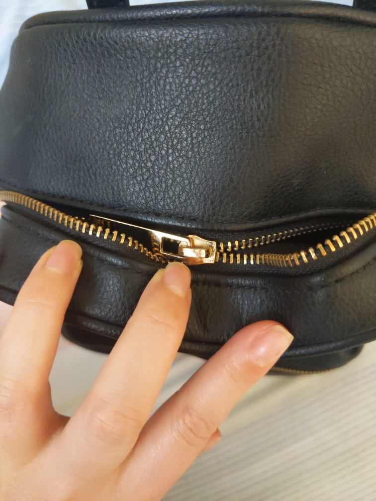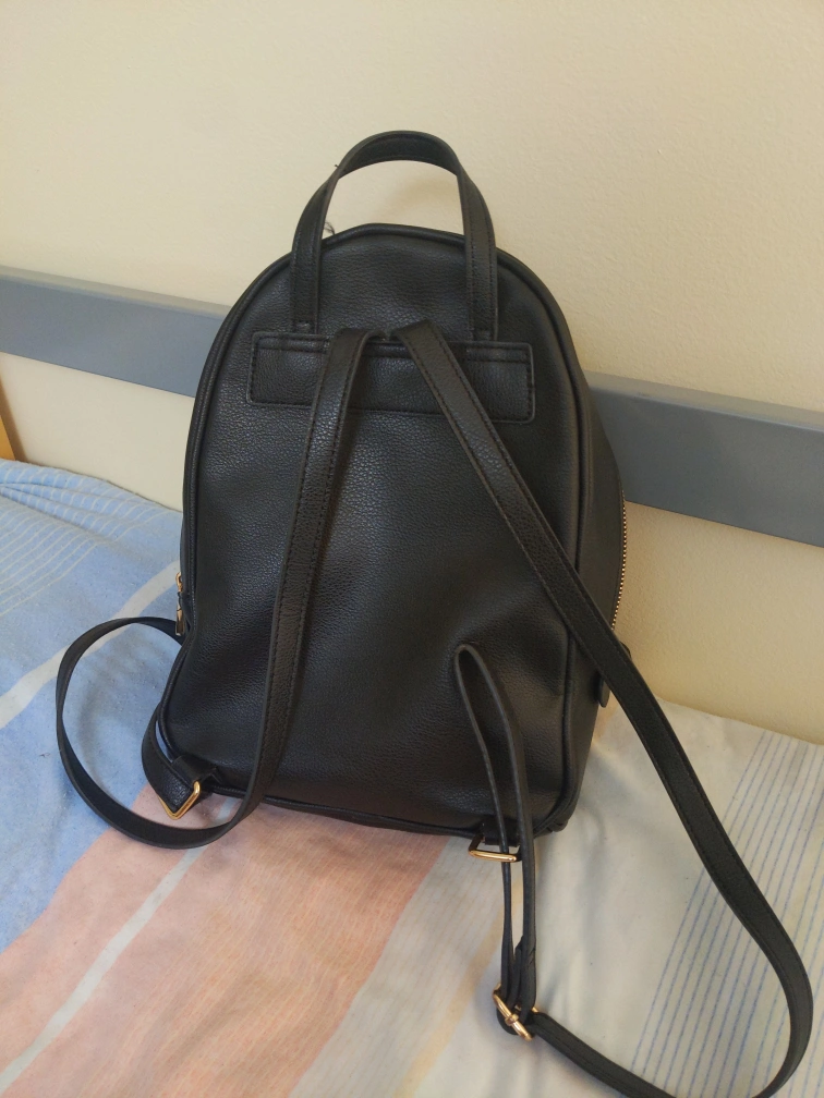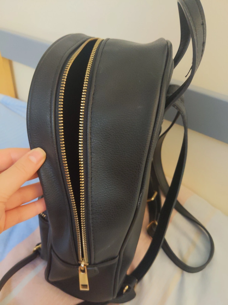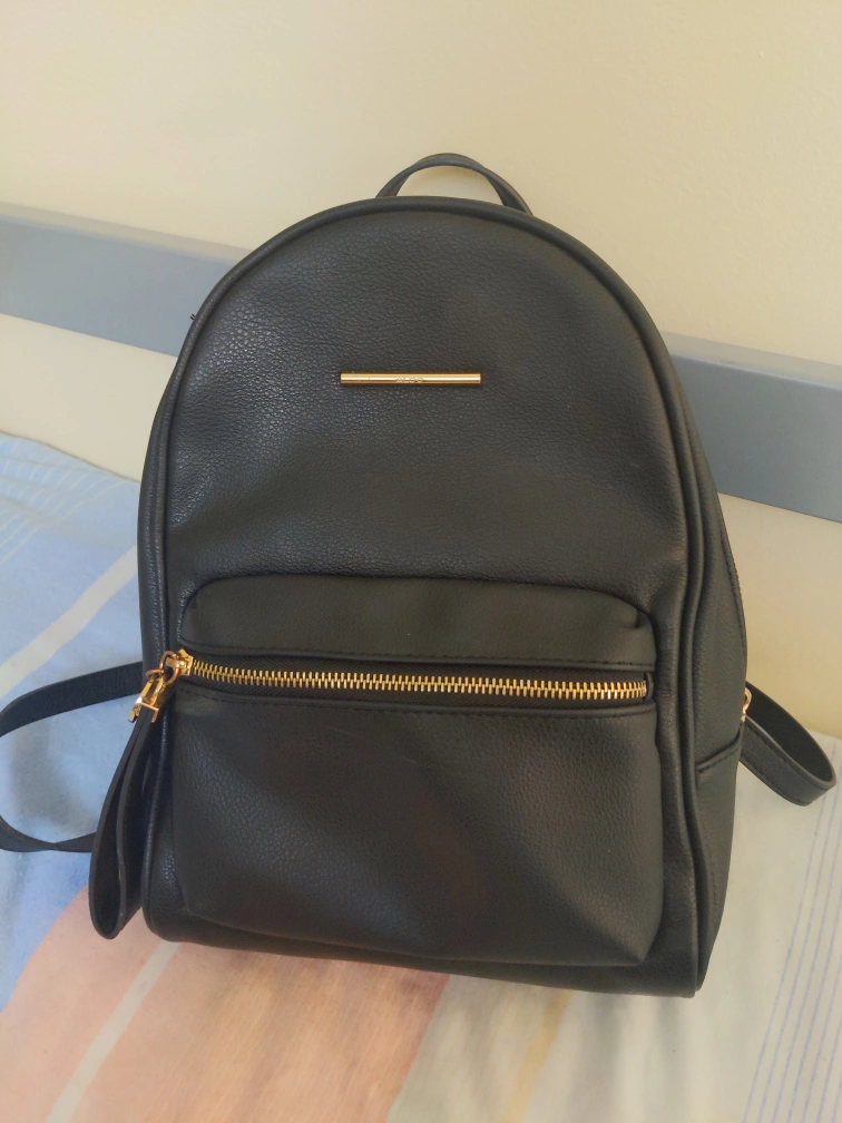 Black faux leather backpack with gold hardware. Has a small zippered pocket inside. Adjustable straps. Small front zipper pocket. The main zipper needs fixing but otherwise in good condition! Size is about 1ft x 9" x 4".