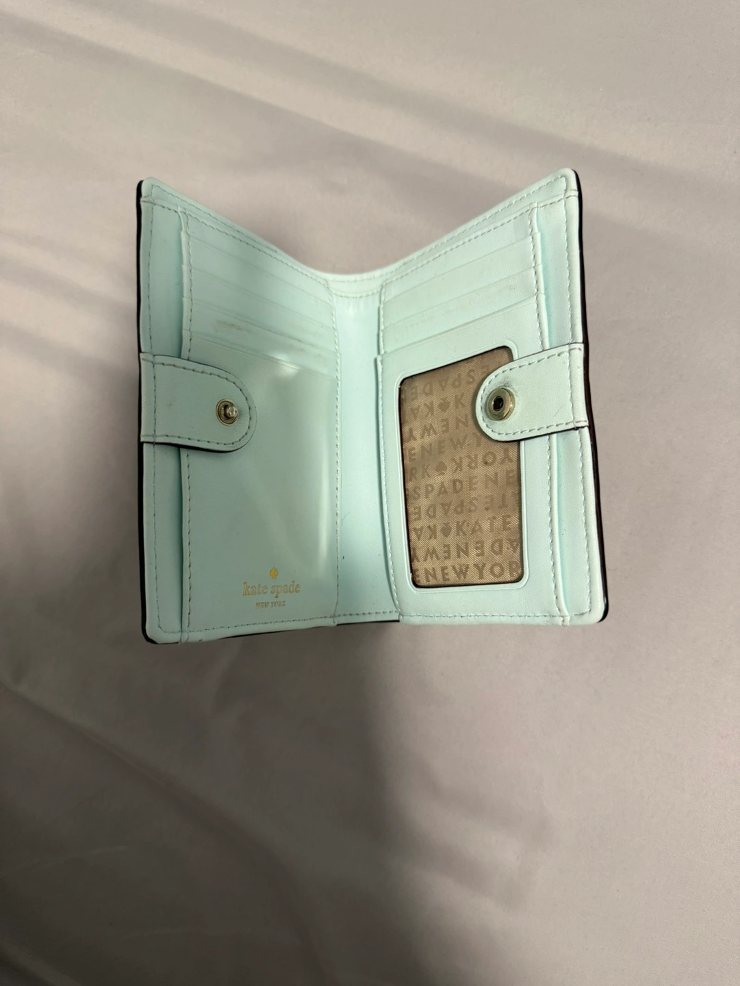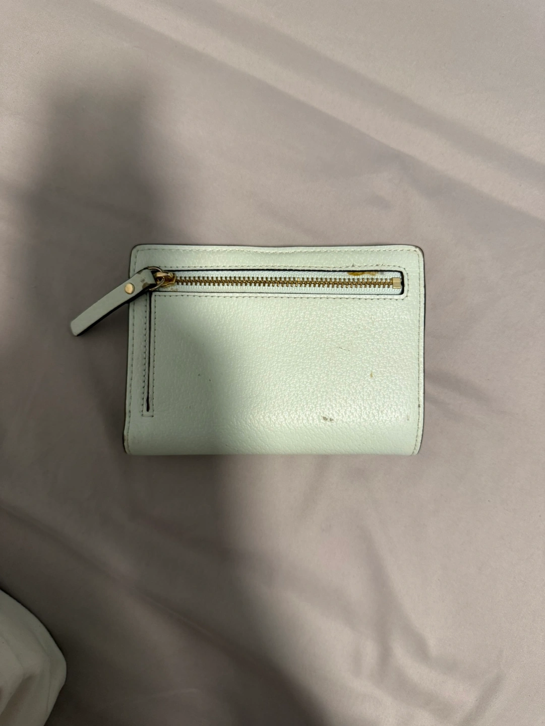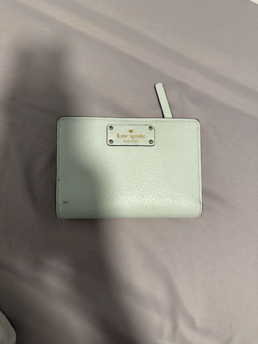 161Small light blue leather wallet. Has a zippered pocket and multiple card slots. Good condition.
