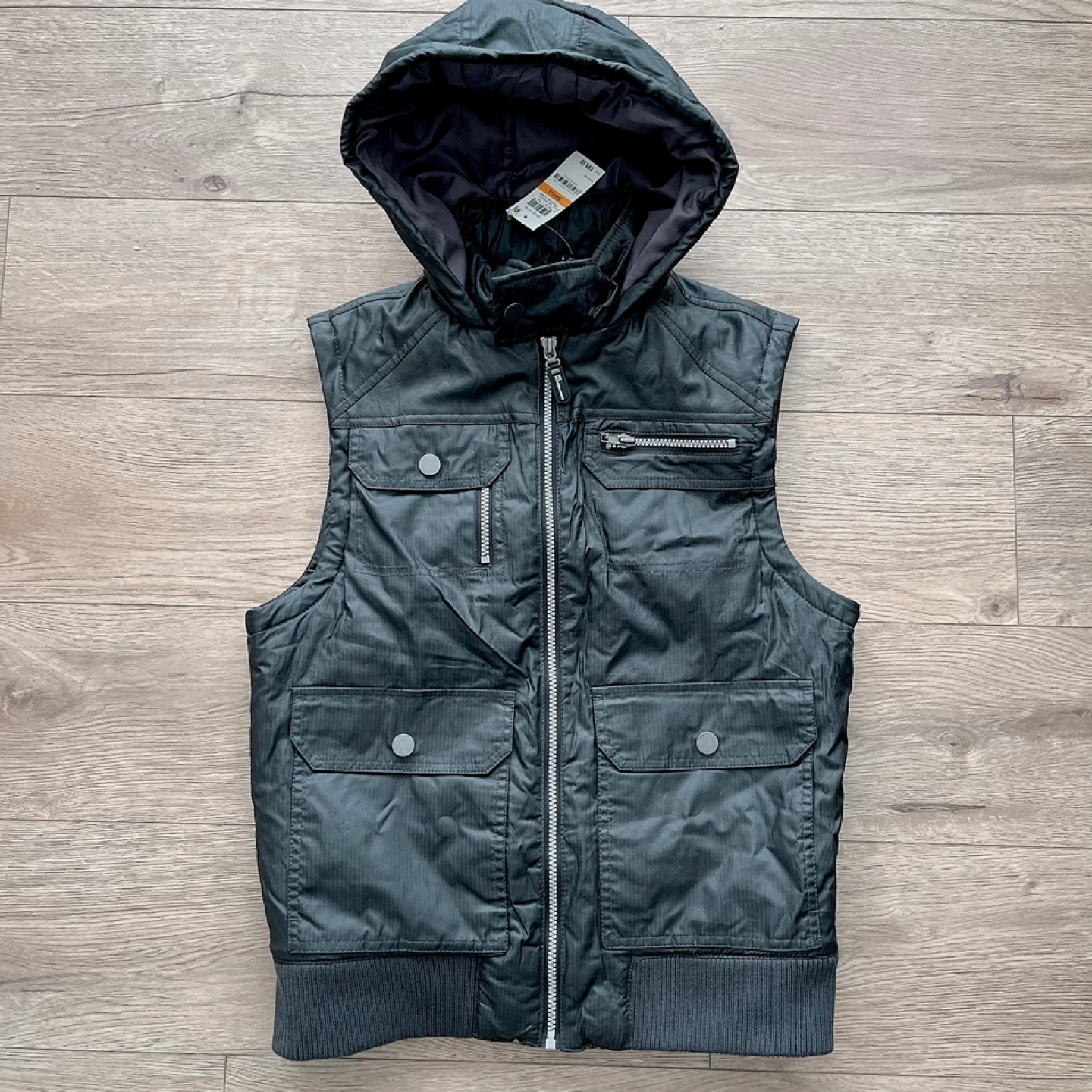 103Black hooded vest with a zipper closure and 4 front pockets. The vest has a red lining and a black rib knit at the bottom. Size S Shoulder to shoulder: 17” Pit to pit: 21” Shoulder to bottom: 25”