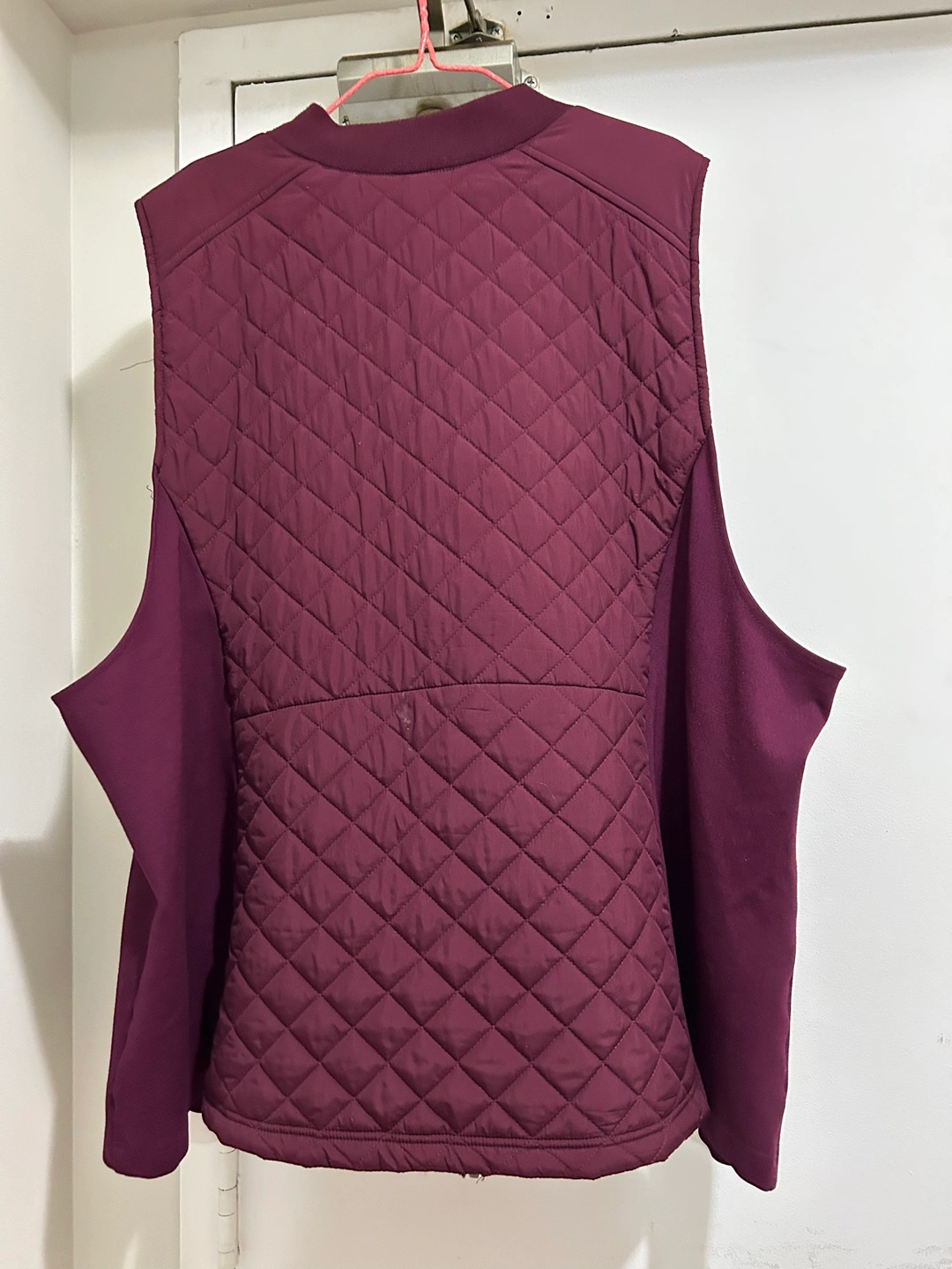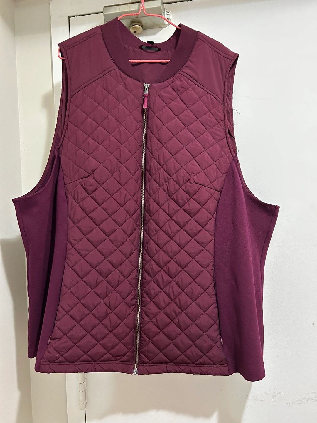 Burgundy quilted vest with zipper closure. Sleeveless and has a stand-up collar. Great for layering in cooler weather.