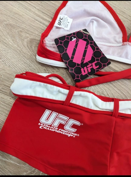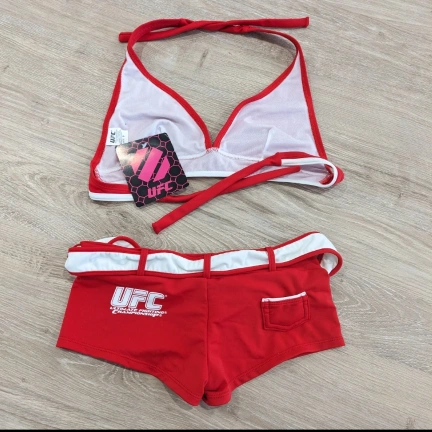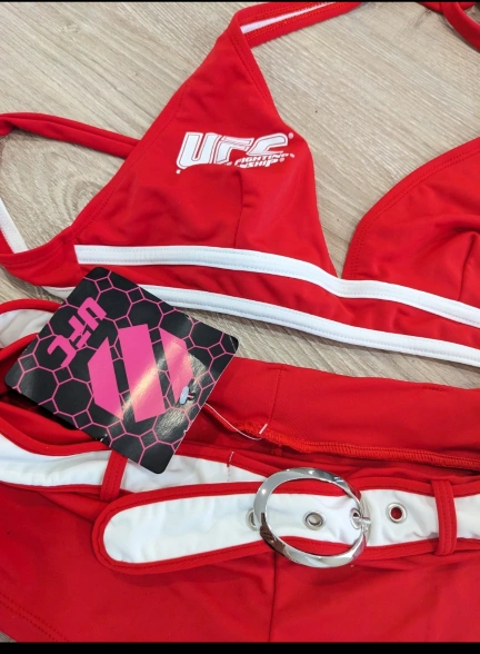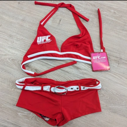 Red and white bikini with UFC logo. Halter top with adjustable straps. Bottoms have a belt with a silver buckle.