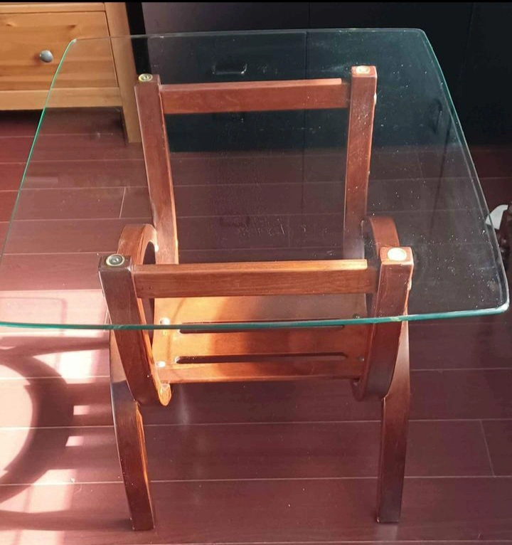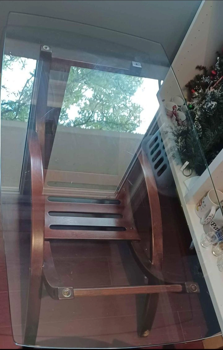 Glass top end table with a wood frame. The table is in good condition, but has some minor scratches on the glass top. It's the perfect size for a small space, and would look great in any living room.