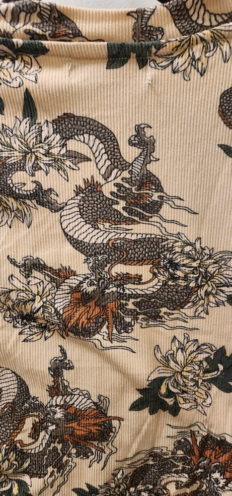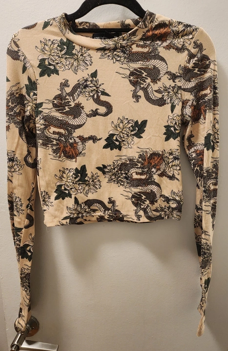 Long sleeve crop top with a dragon and floral print. Size Small. Cream colour.