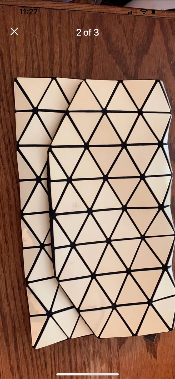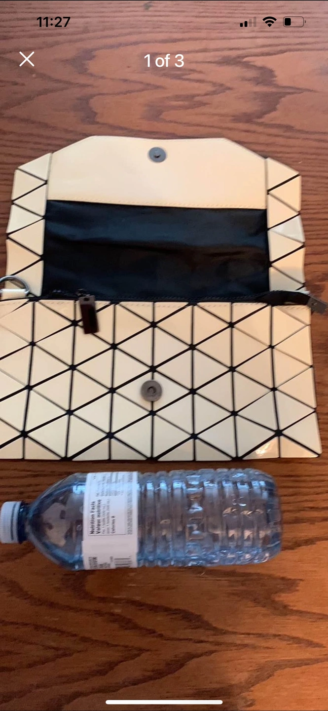 745White clutch with black geometric pattern. Features zipper closure and a small strap.