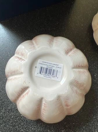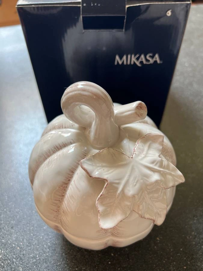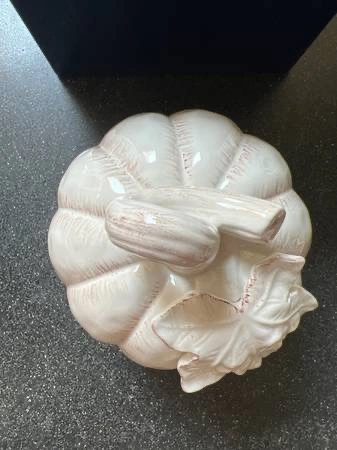 170White pumpkin shaped soup bowl , with a leaf and stem. It is part of the Countryside Harvest collection.