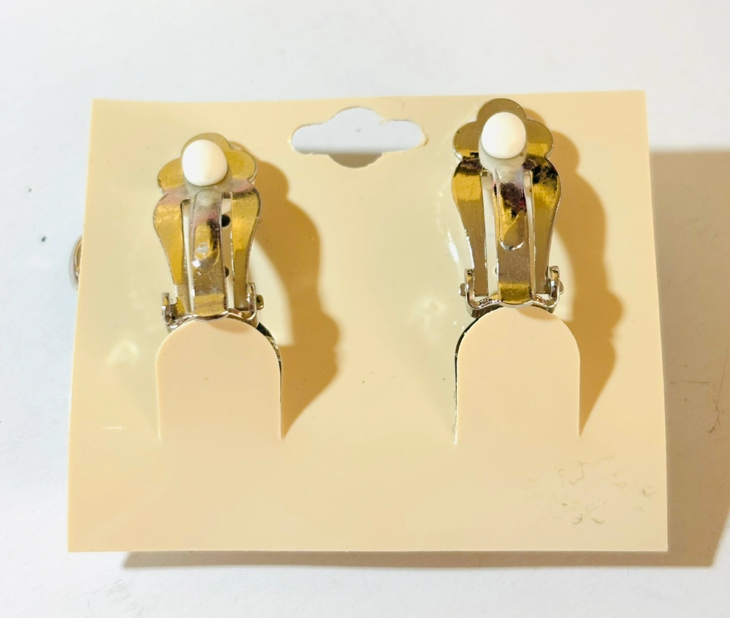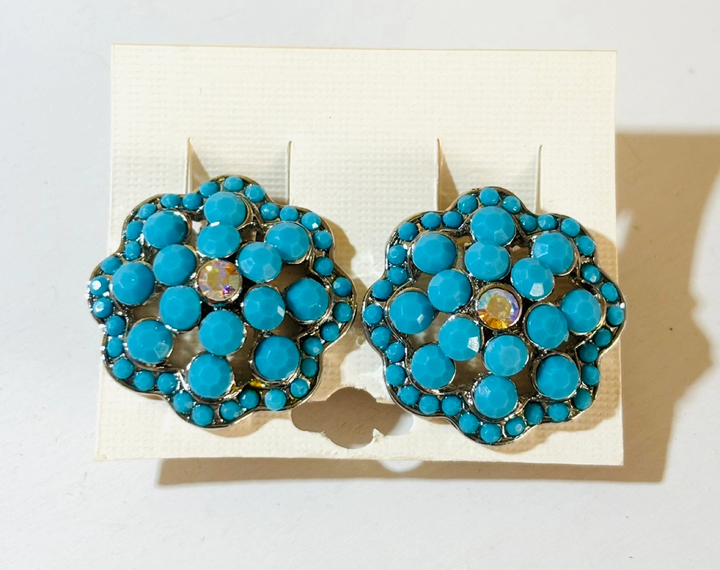 Blue clip on earrings with rhinestones in the center. They are in the shape of a flower.