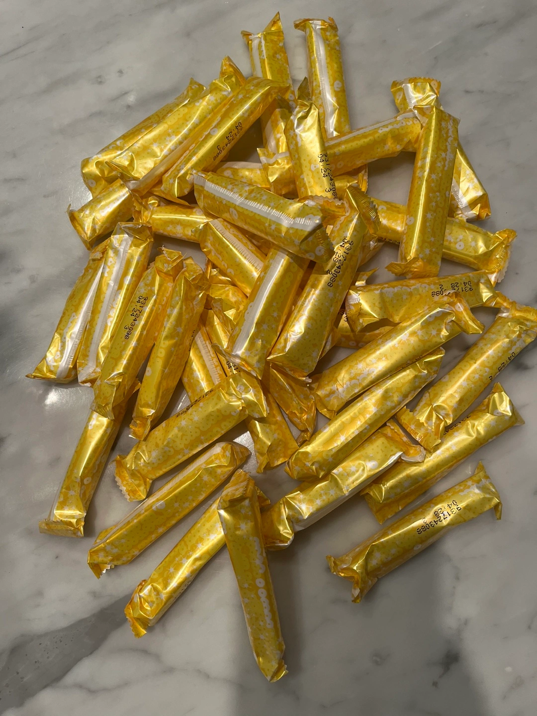 A bulk pack of 39 regular tampons. Individually wrapped. Please only reach out if interested in purchasing.
