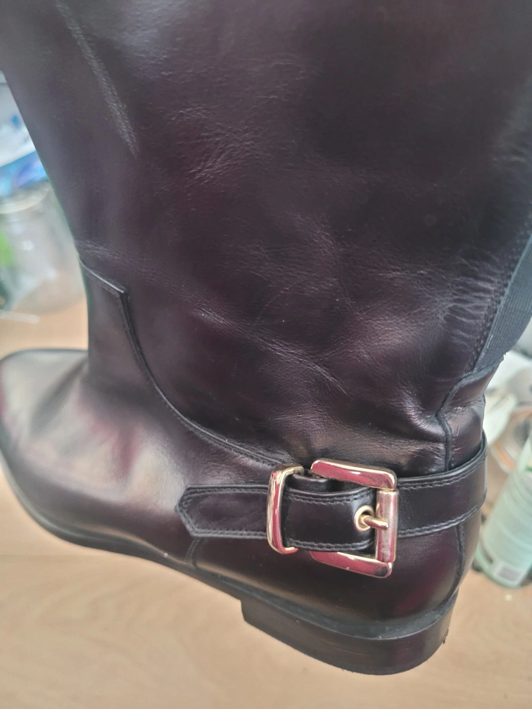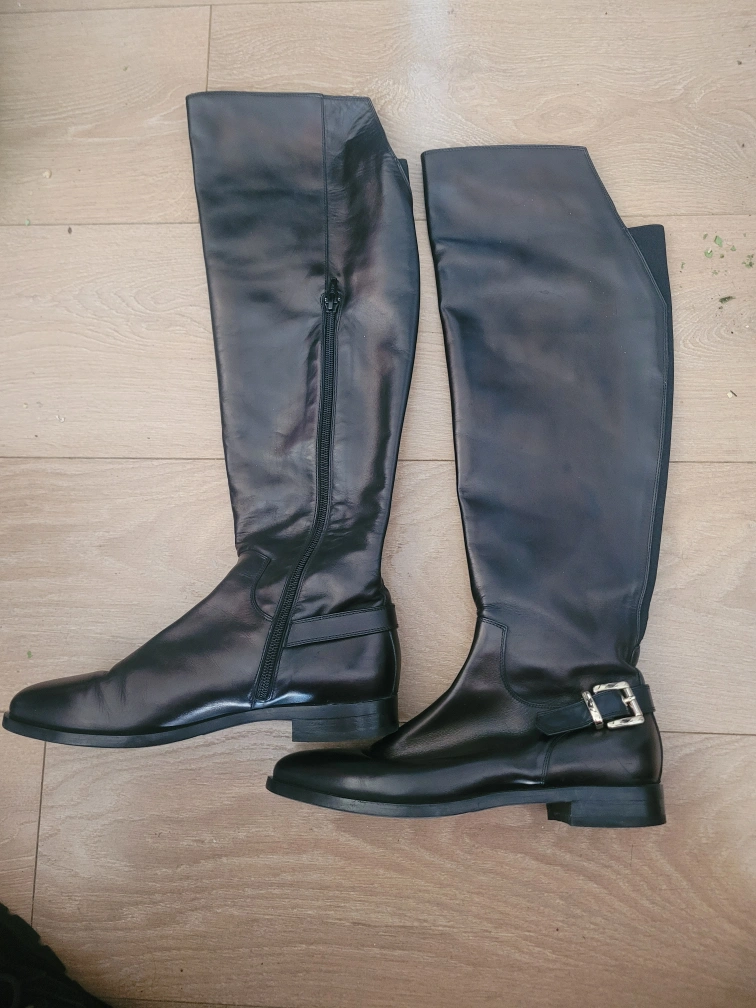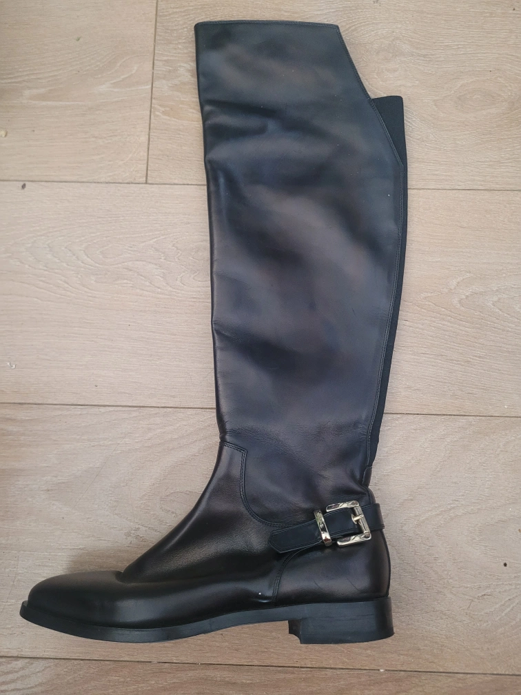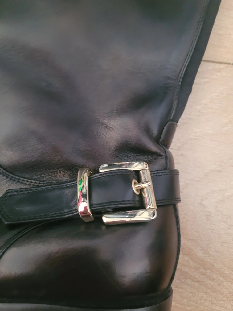 Black leather knee-high boots with a gold buckle. Made in Italy. Size 37.