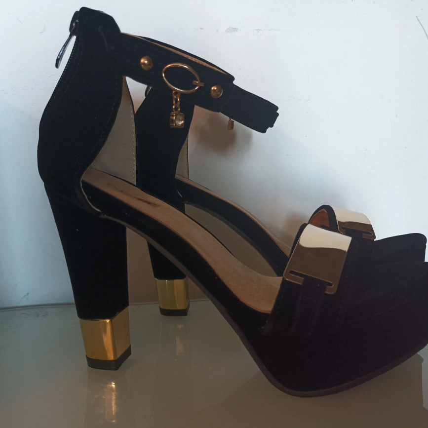 Black suede platform heels with gold accents and a zipper closure. Ankle strap with a charm. Platform sole.