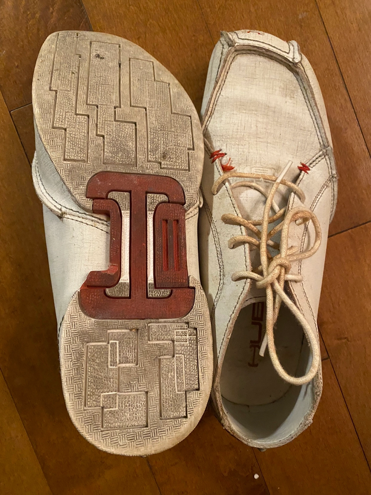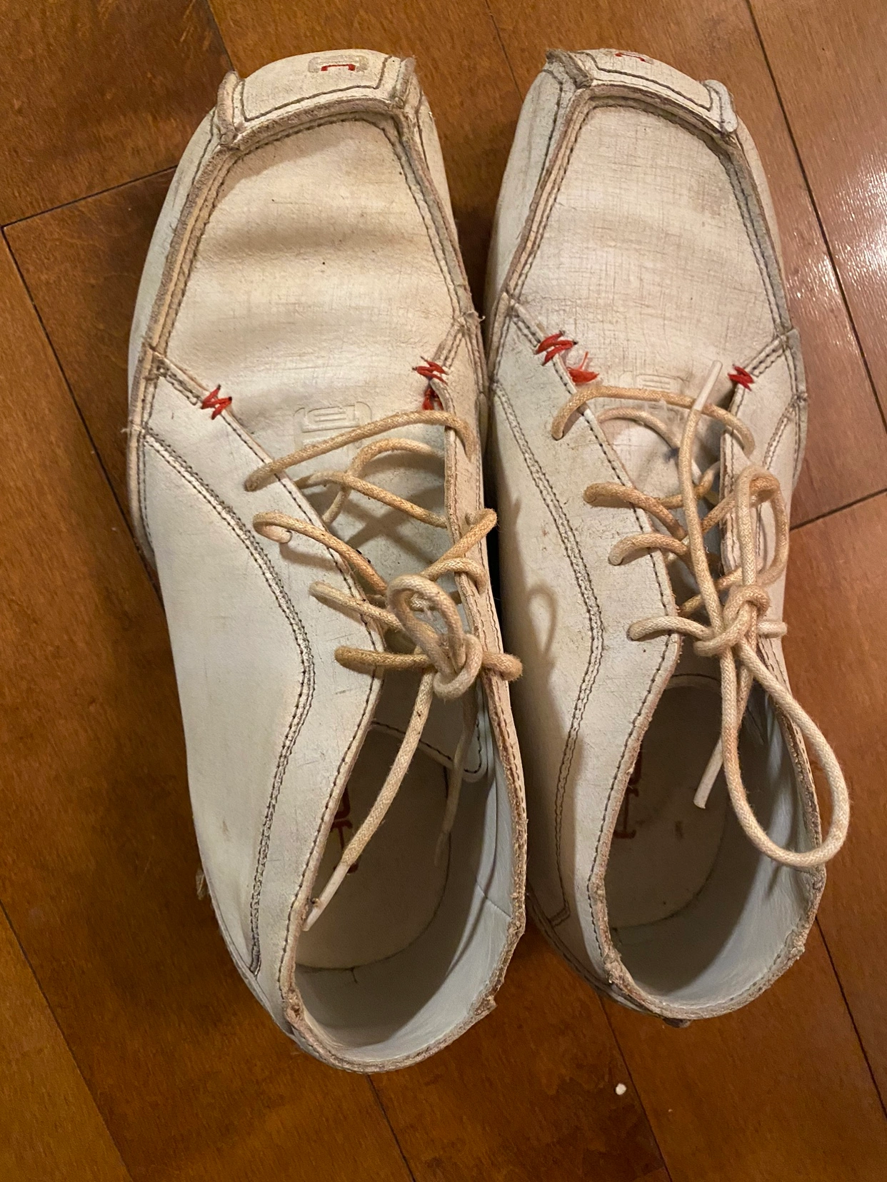 53White leather shoes with red stitching. Lace-up closure.