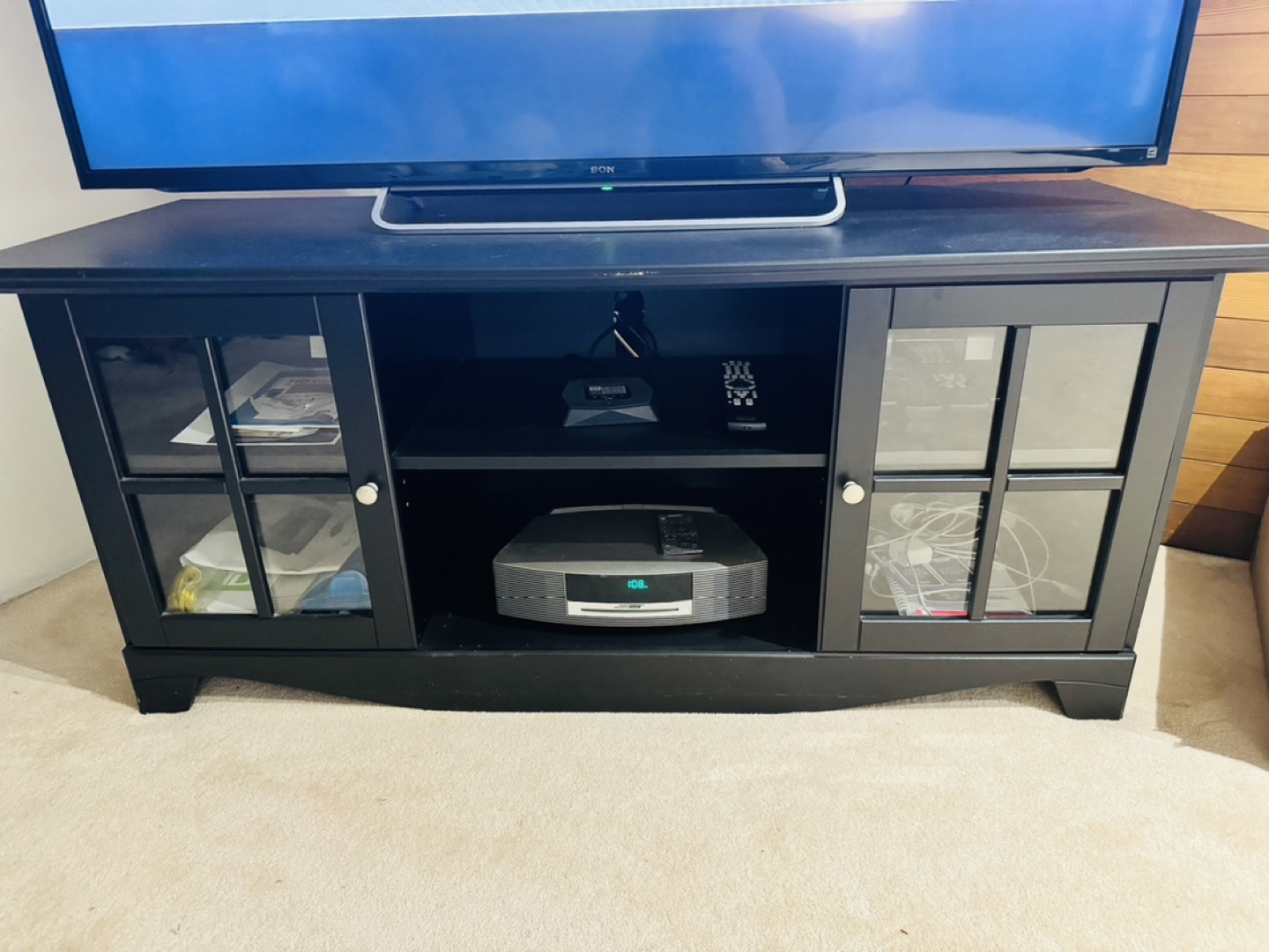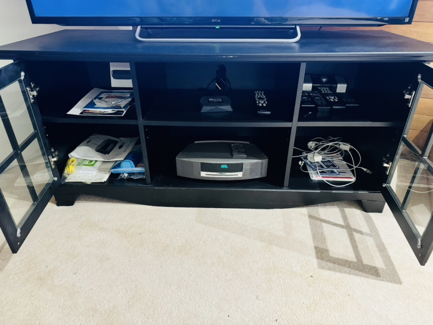Black TV Stand with glass doors and two shelves.