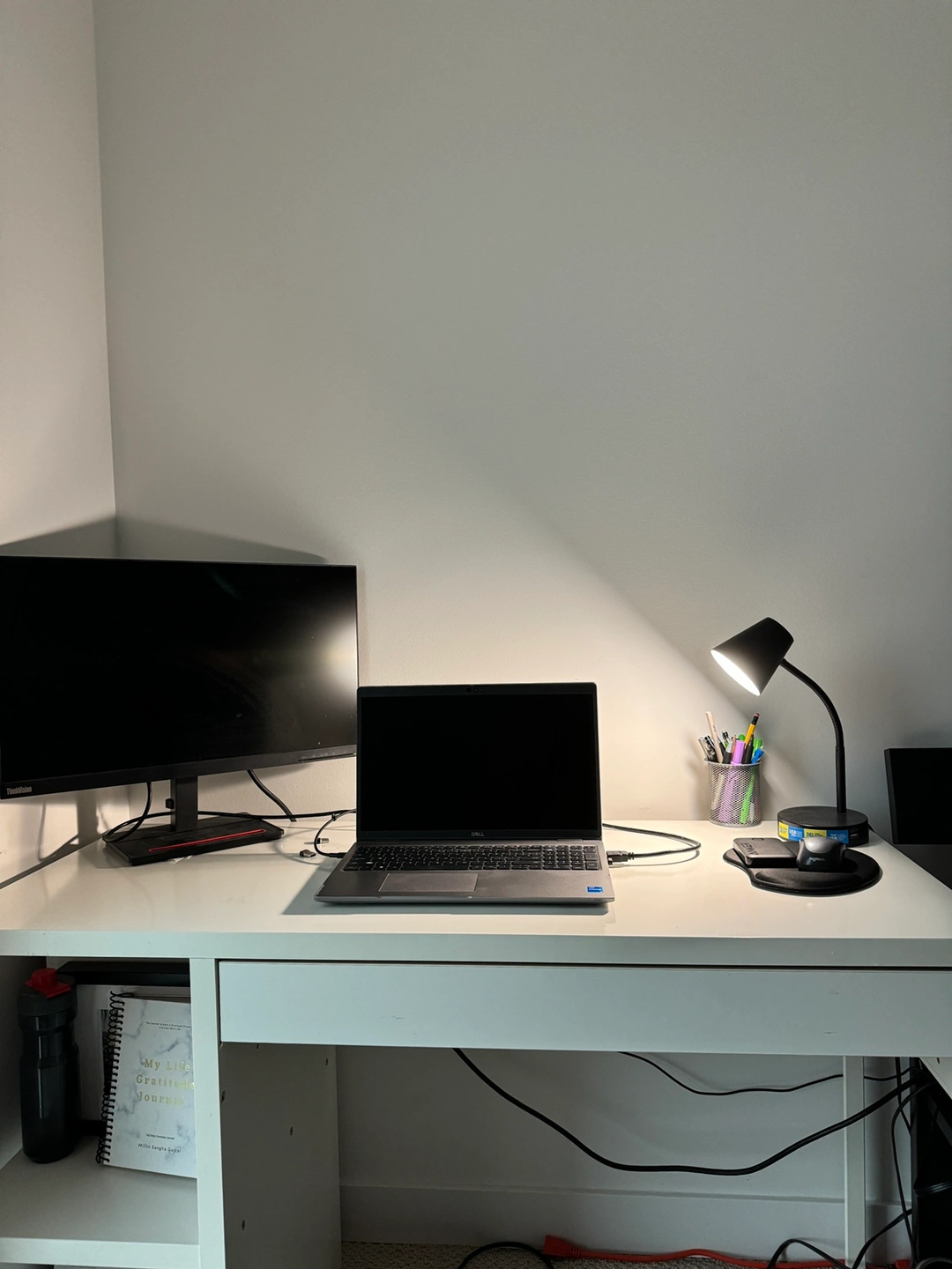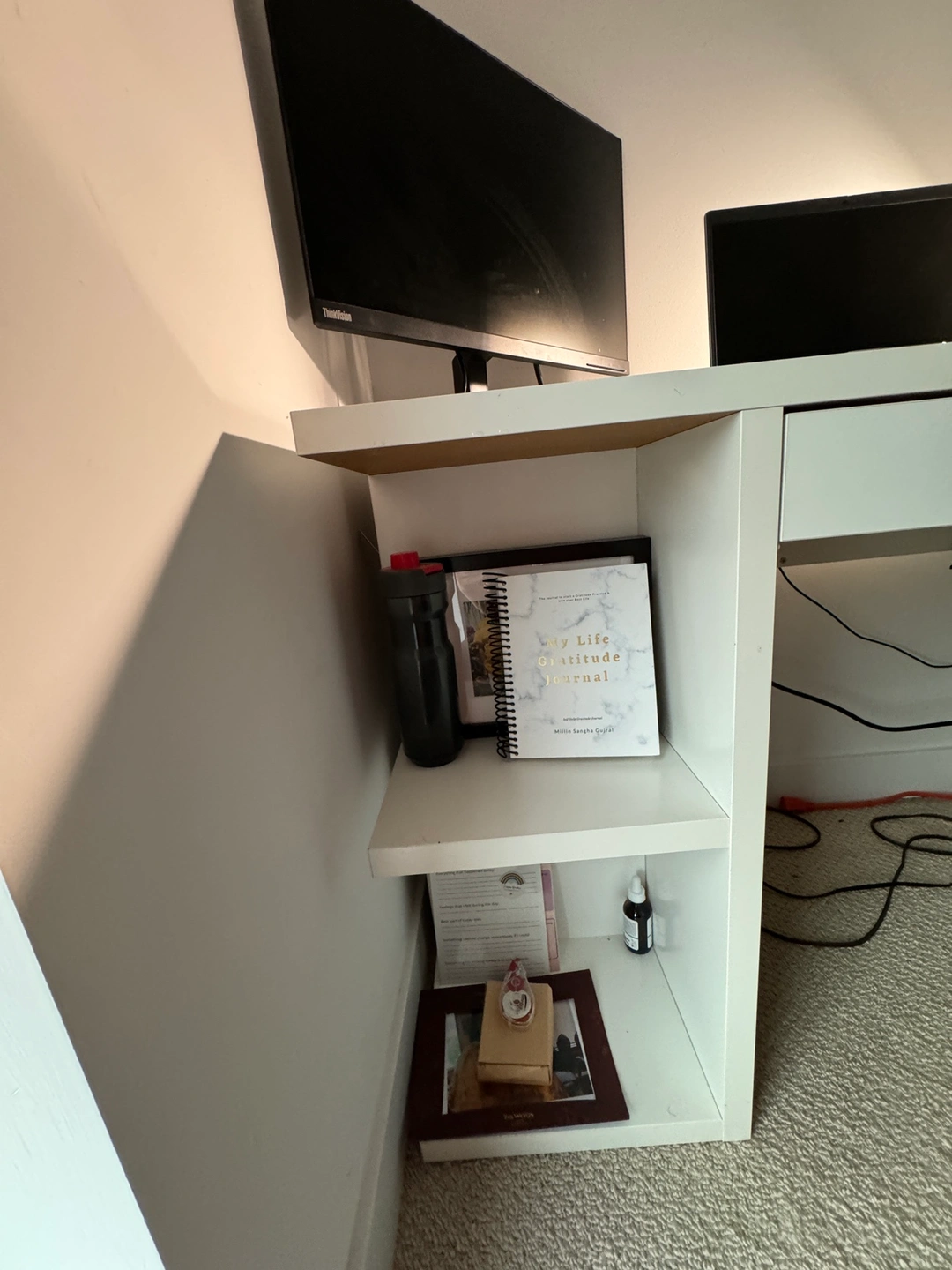 White computer desk with a shelf and drawer. The desk has some wear and tear but is still in good condition.