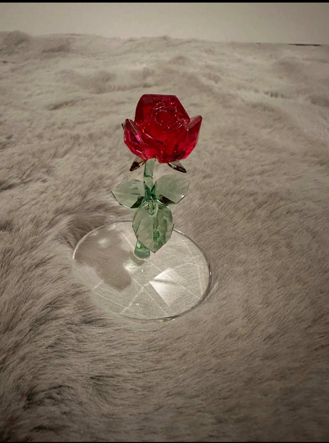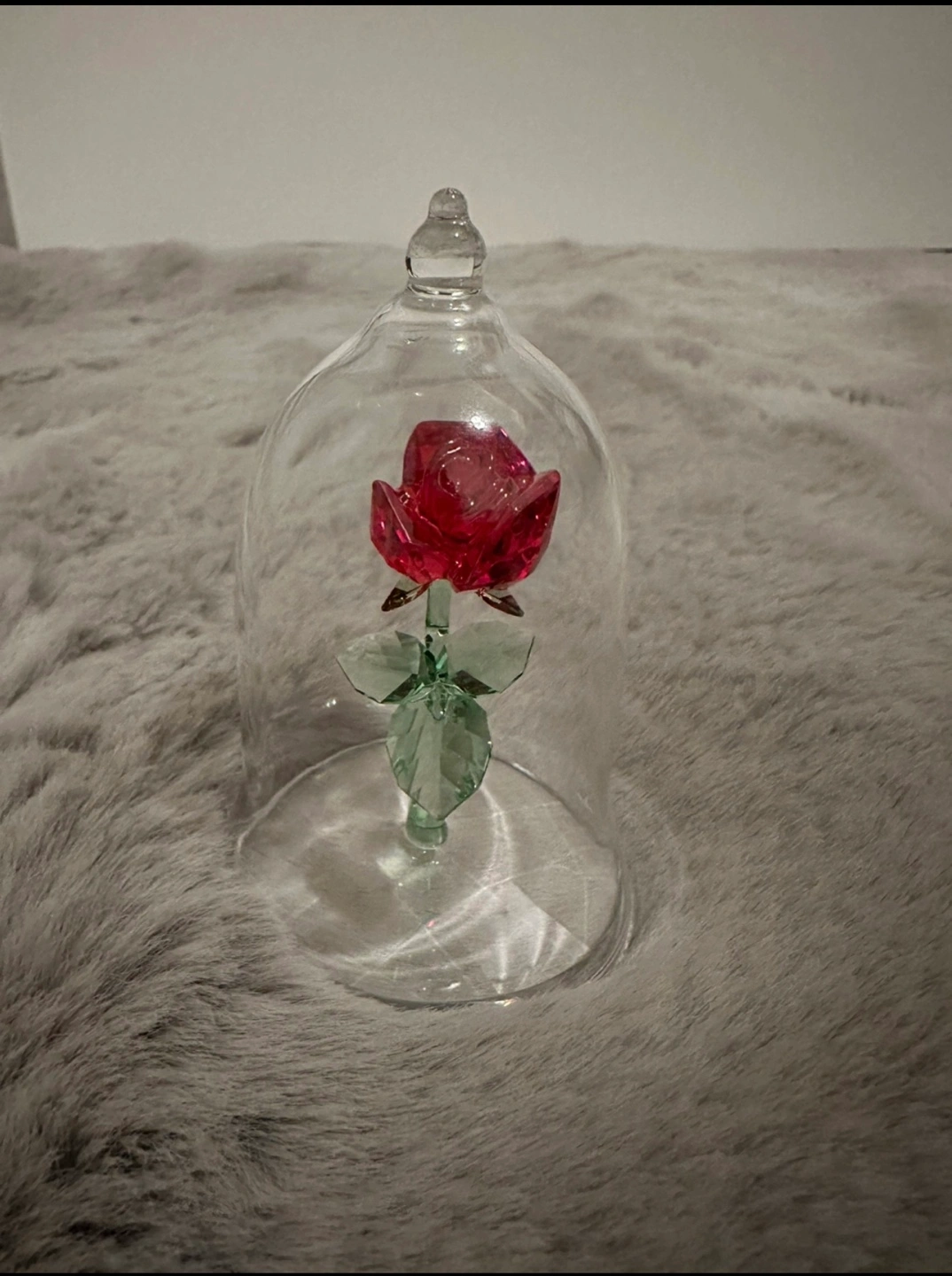 This is an authentic, detailed representation of the iconic rose in the Disney movie Beauty and the Beast. Elegantly displayed inside a high quality, mouth-blown glass bell jar, the rose is exquisitely crafted in red and green crystal with a clear crystal base, giving a total of 223 sparkling facets.