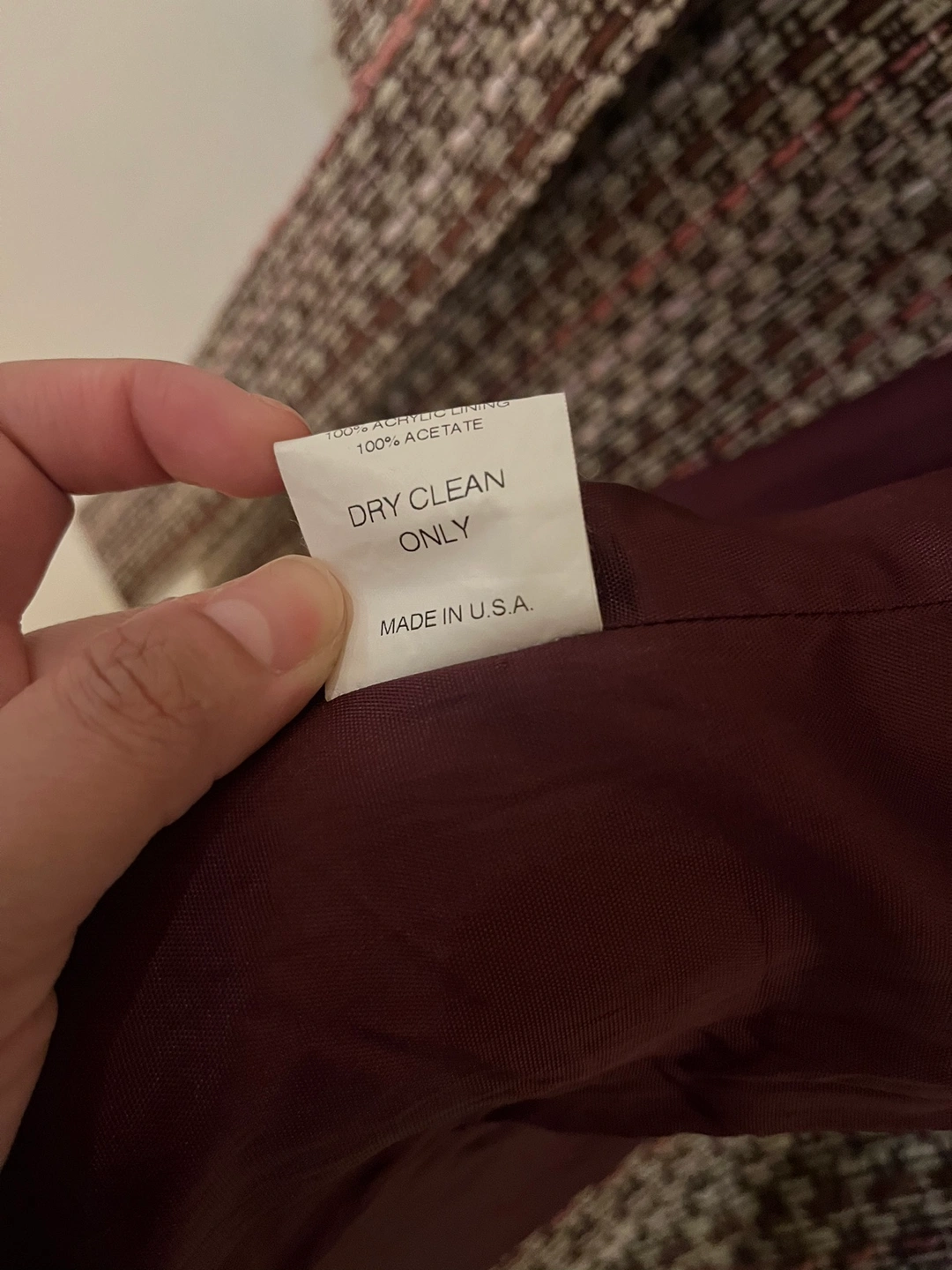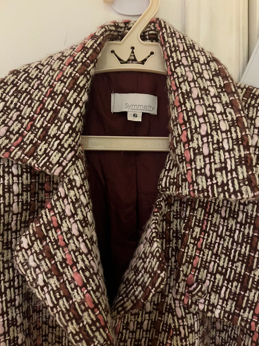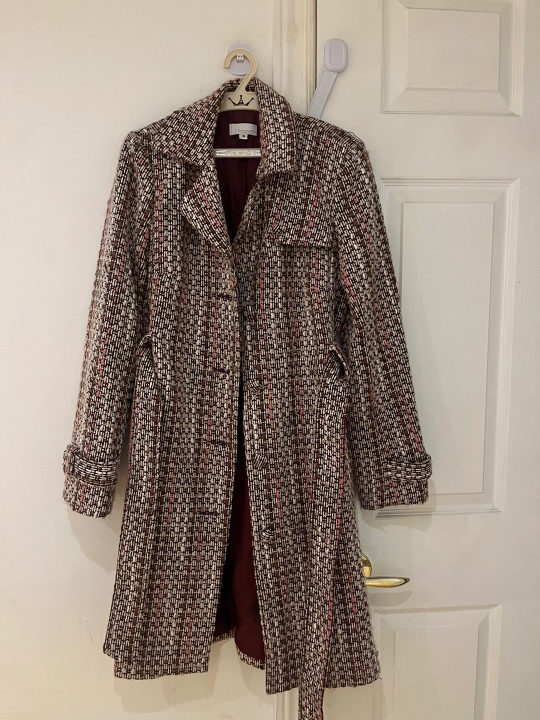 Tweed coat with a belt. Brown, pink, and white pattern.