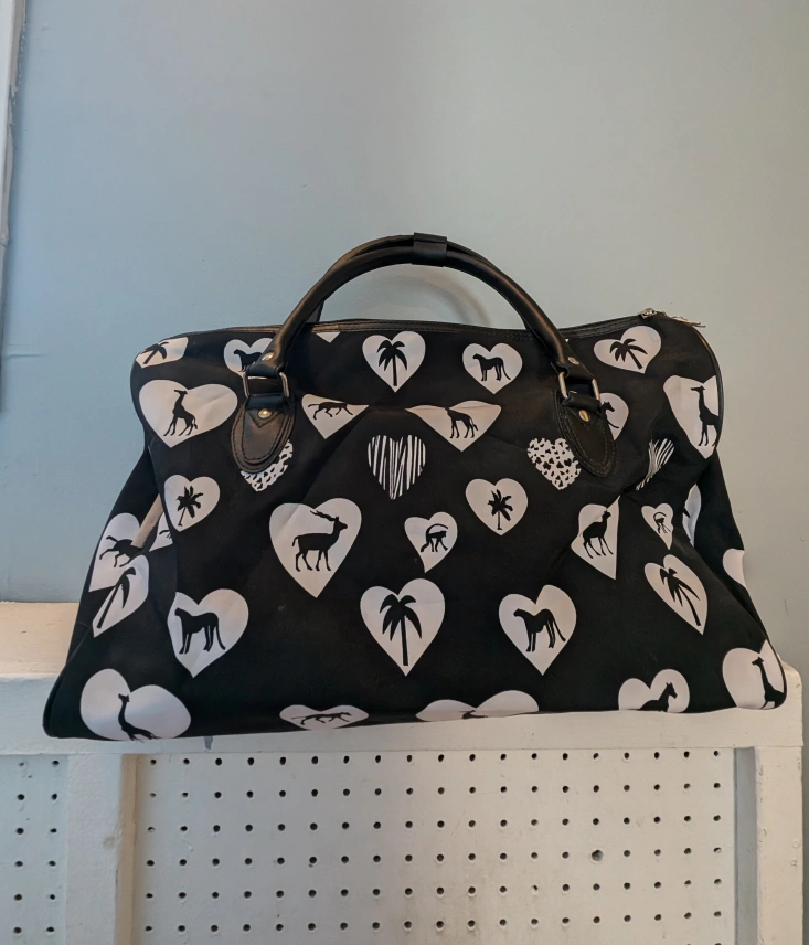 Nice quality large black and white weekender duffel bag with a heart pattern featuring various animals and palm trees. The bag has black leather accents and is in very good condition. The bag does have a lock on the side (pictured) that I do not have the key to, but it's not large or unsightly. Check out my other listings, I will be doing some decluttering!