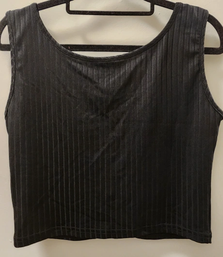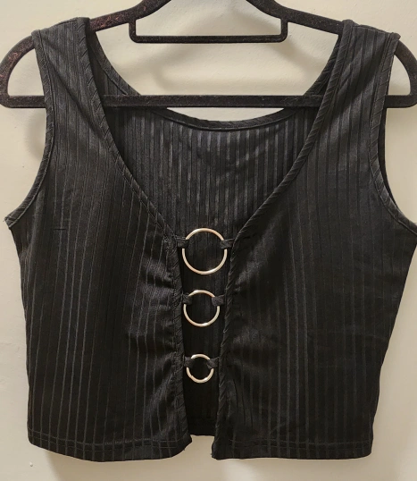 Sleeveless black crop top with a ribbed texture and three silver rings at the centre back.