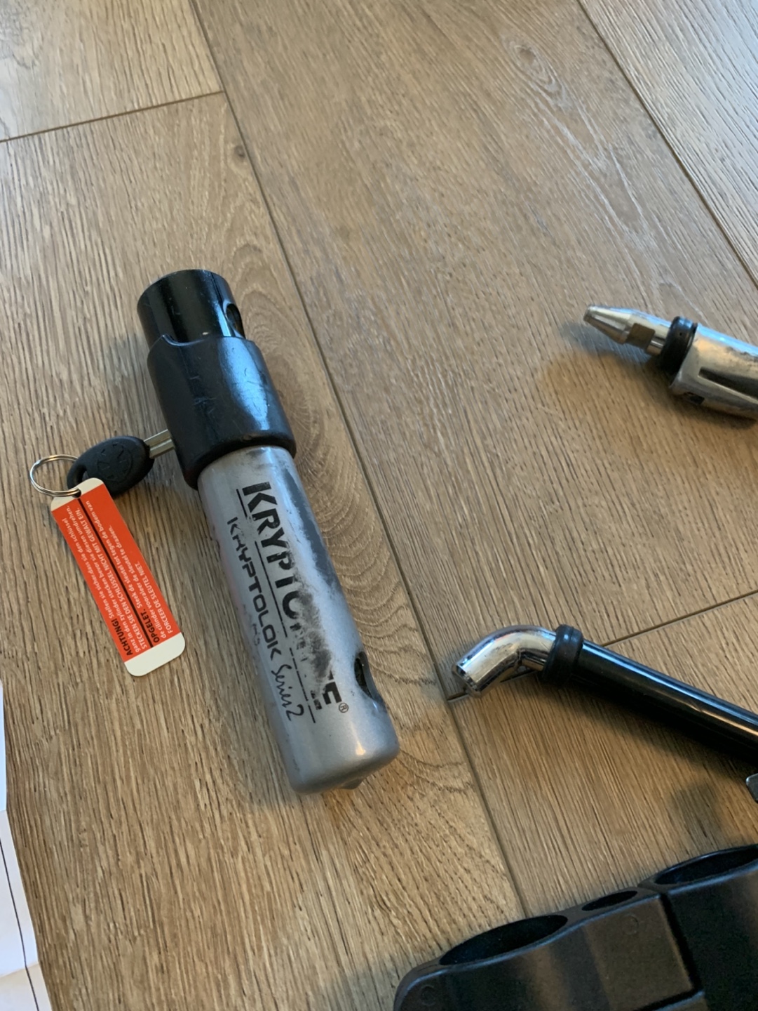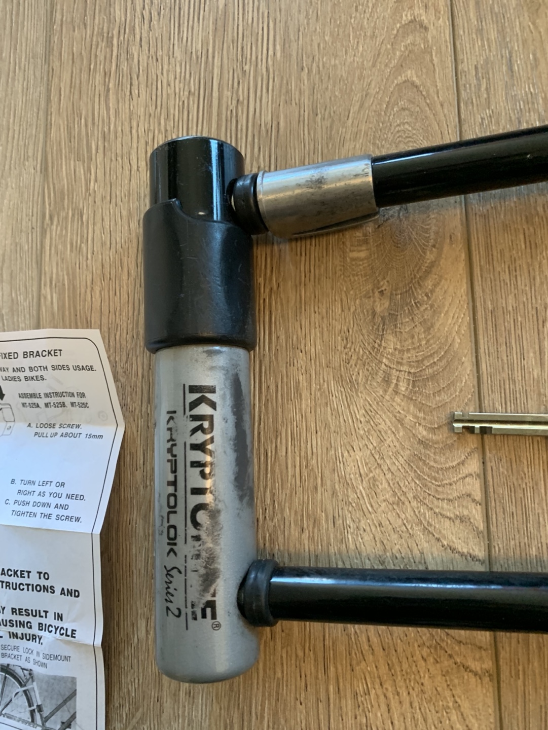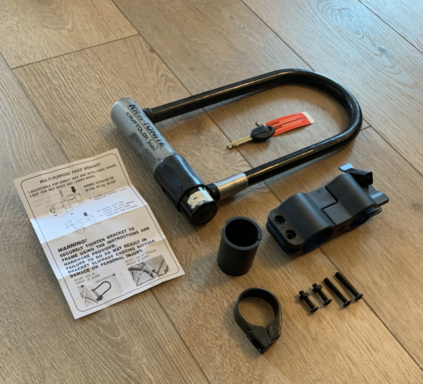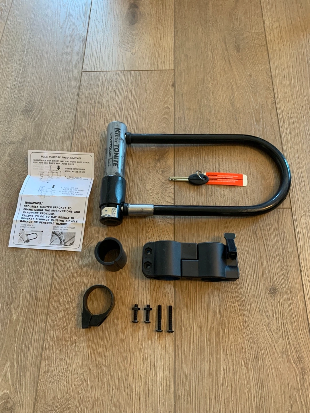 U-Lock with key, mounting bracket and hardware. Includes instructions.