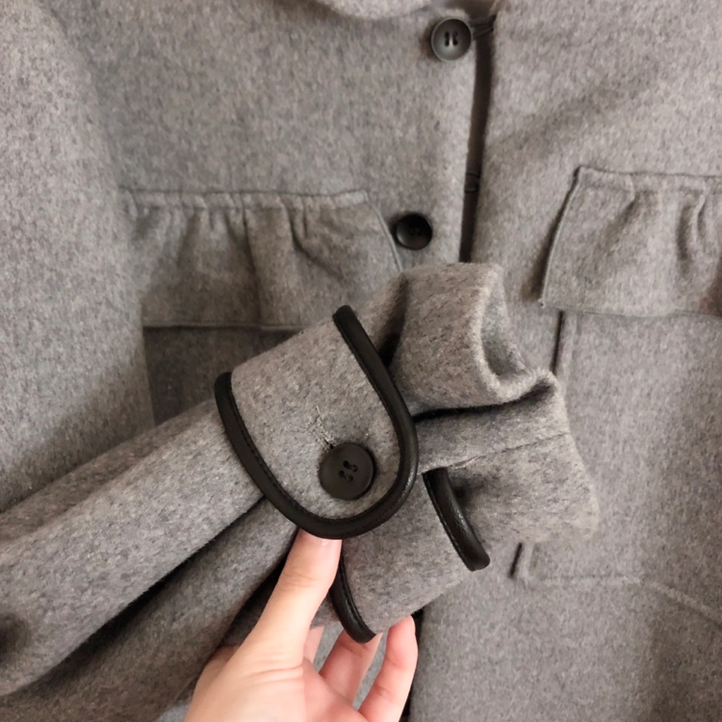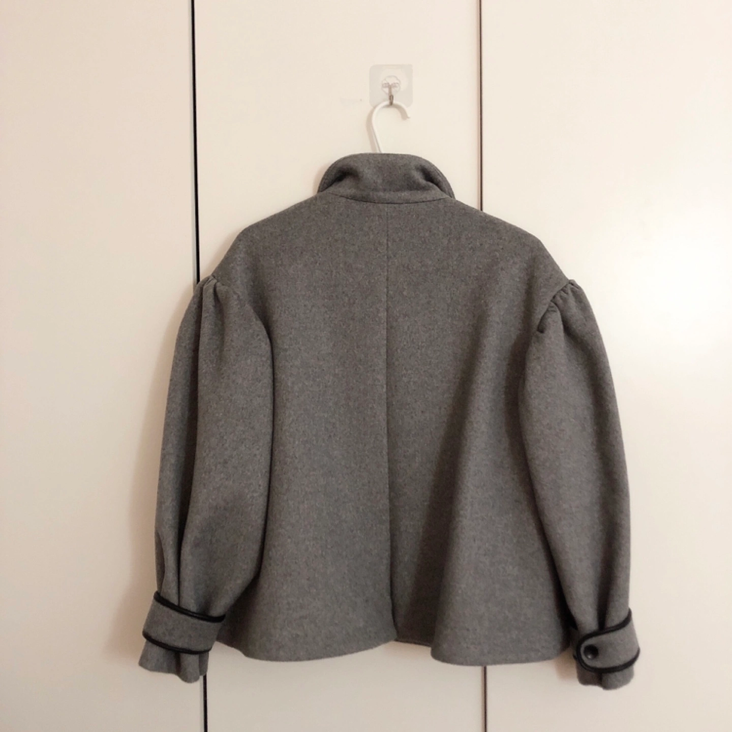 Grey wool jacket with a ruffled front, button closure and black piping. The sleeves are puffed and have a black trim.