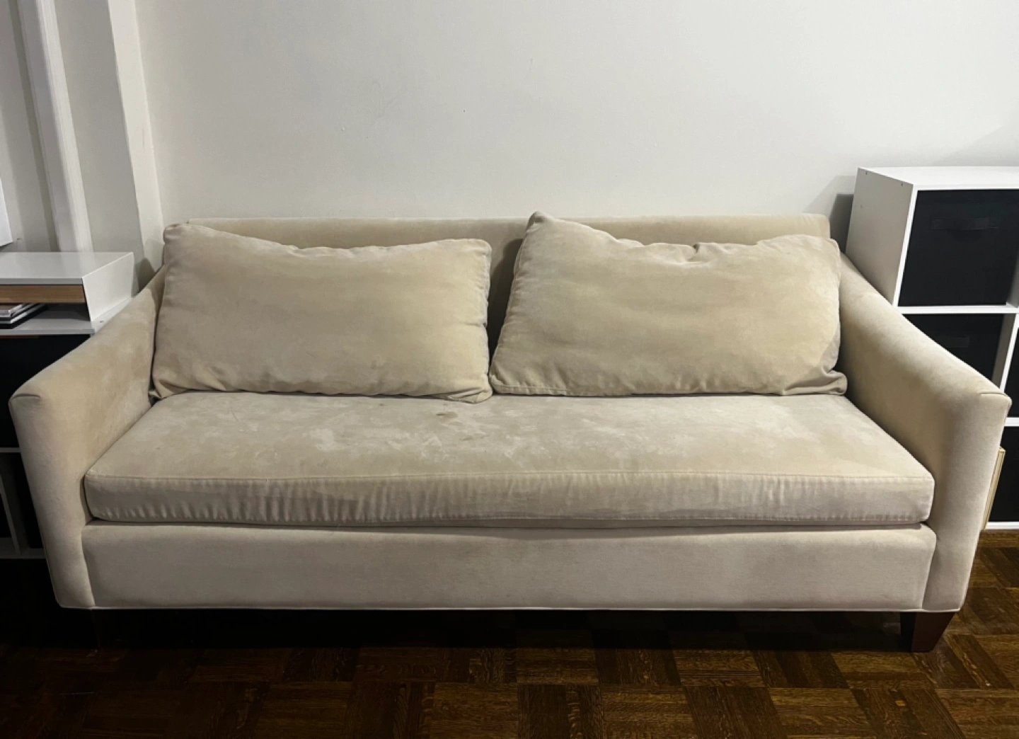 Beige sofa with two pillows. Some minor stains.