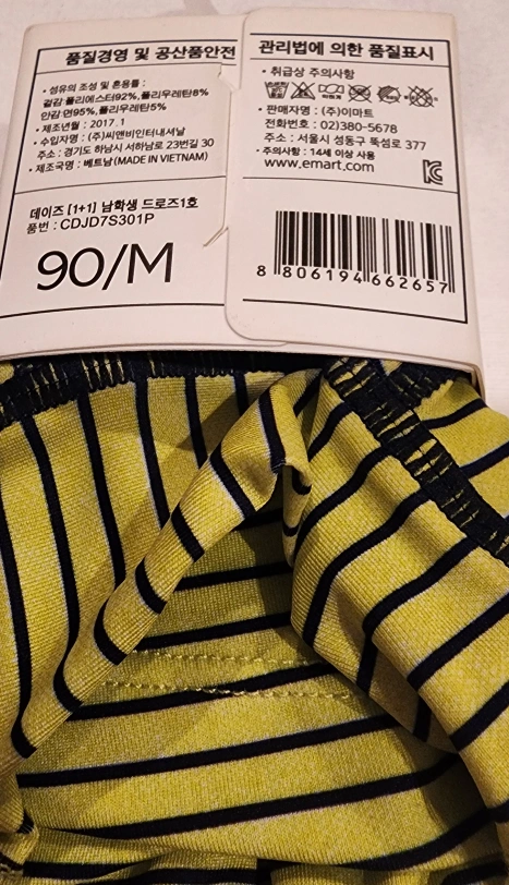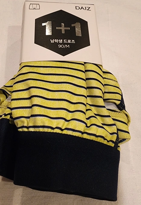 Bright yellow and blue stripe pattern with navy waistband. Size M./90