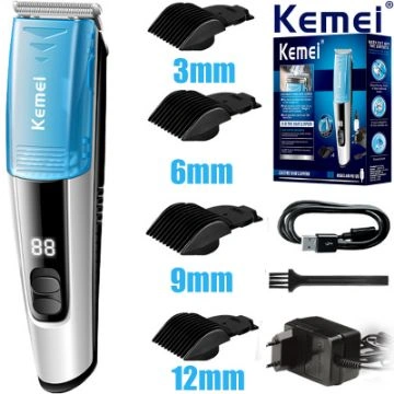 234Electric hair clipper with multiple length attachments, charging cable and cleaning brush. Includes display screen.