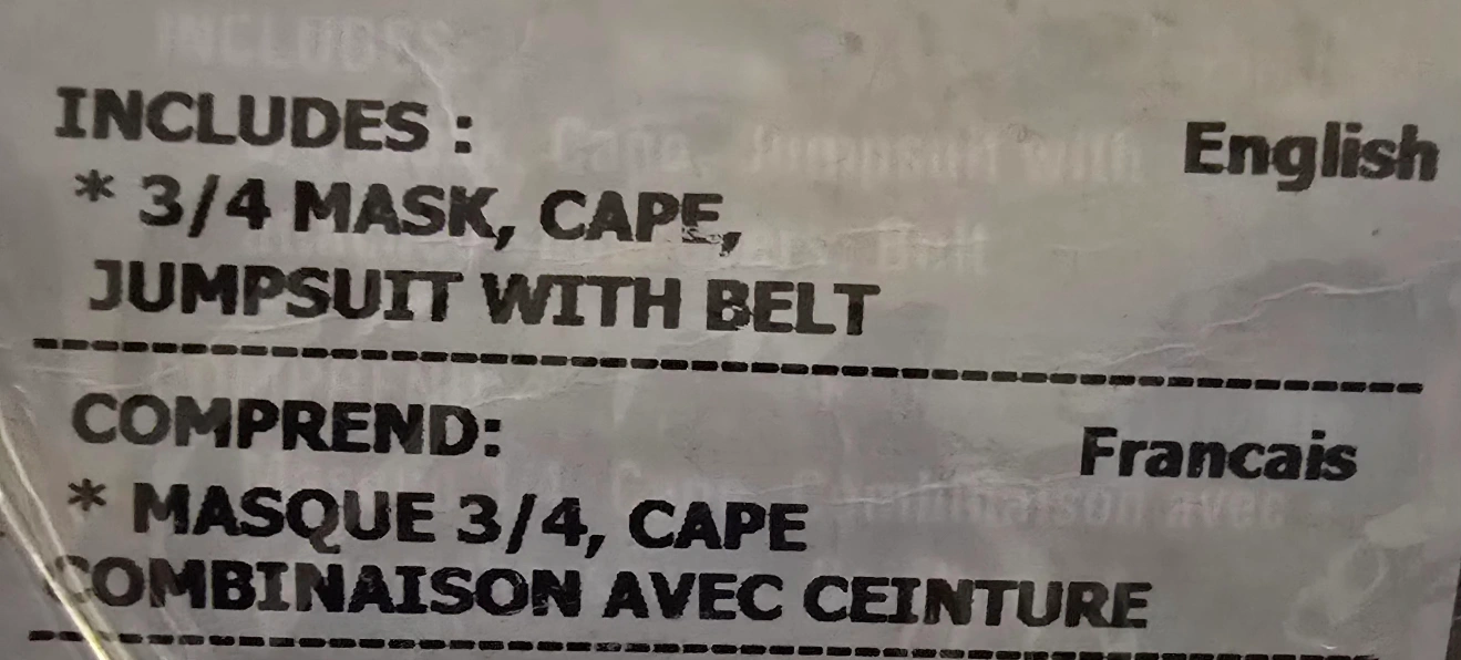 Child costume, includes 3/4 mask, cape, jumpsuit with belt. Size Medium (US size 8-10) for ages 5-7.