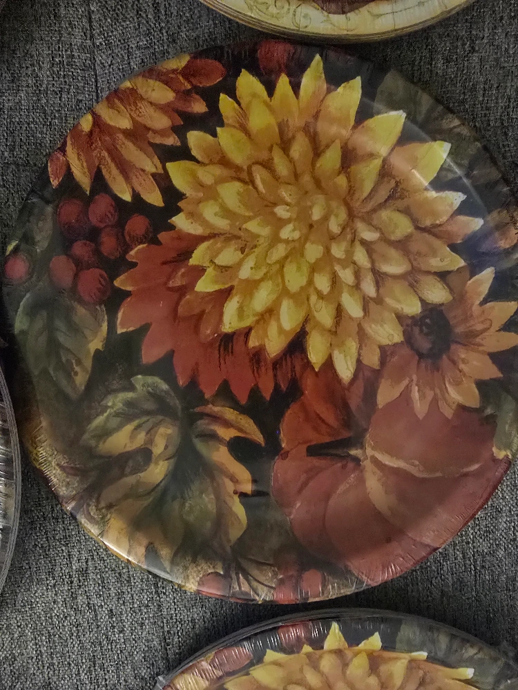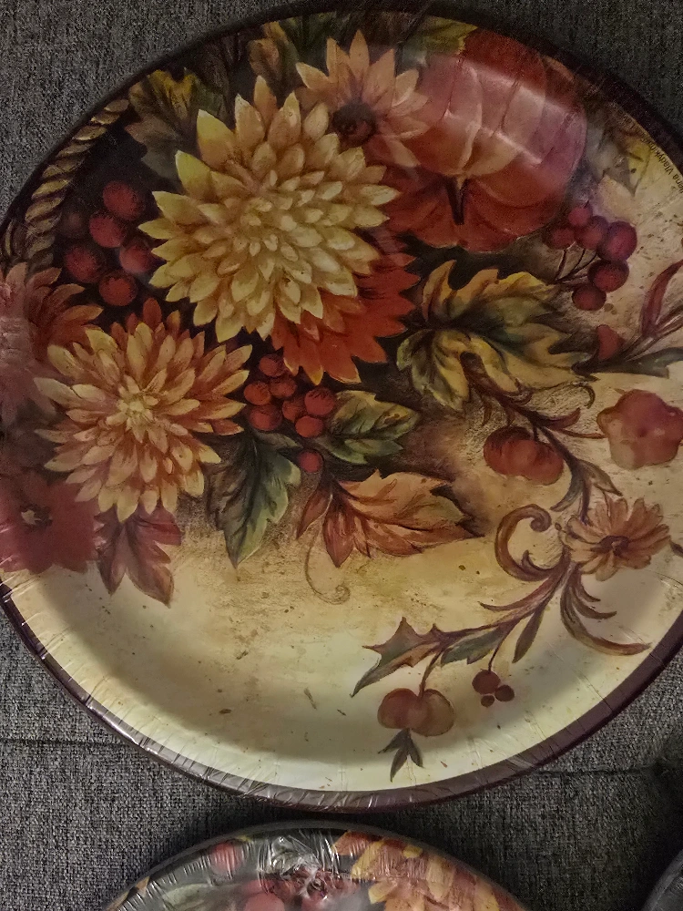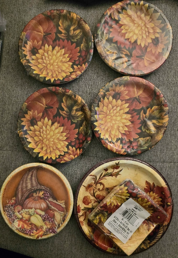 Set of paper plates with a fall harvest theme. One plate features a cornucopia design and the others feature a floral design. All plates are in brand new condition and still in packaging. 50 small plates and 10 large plates+16 napkins.