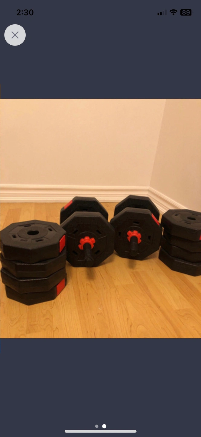 Set of dumbbells. Includes multiple plates and a bar. Can be combined for different weights.