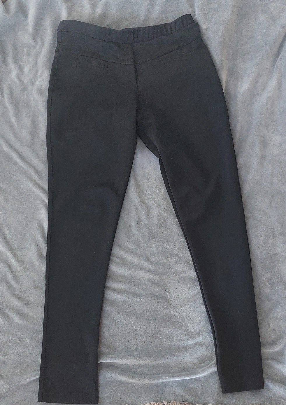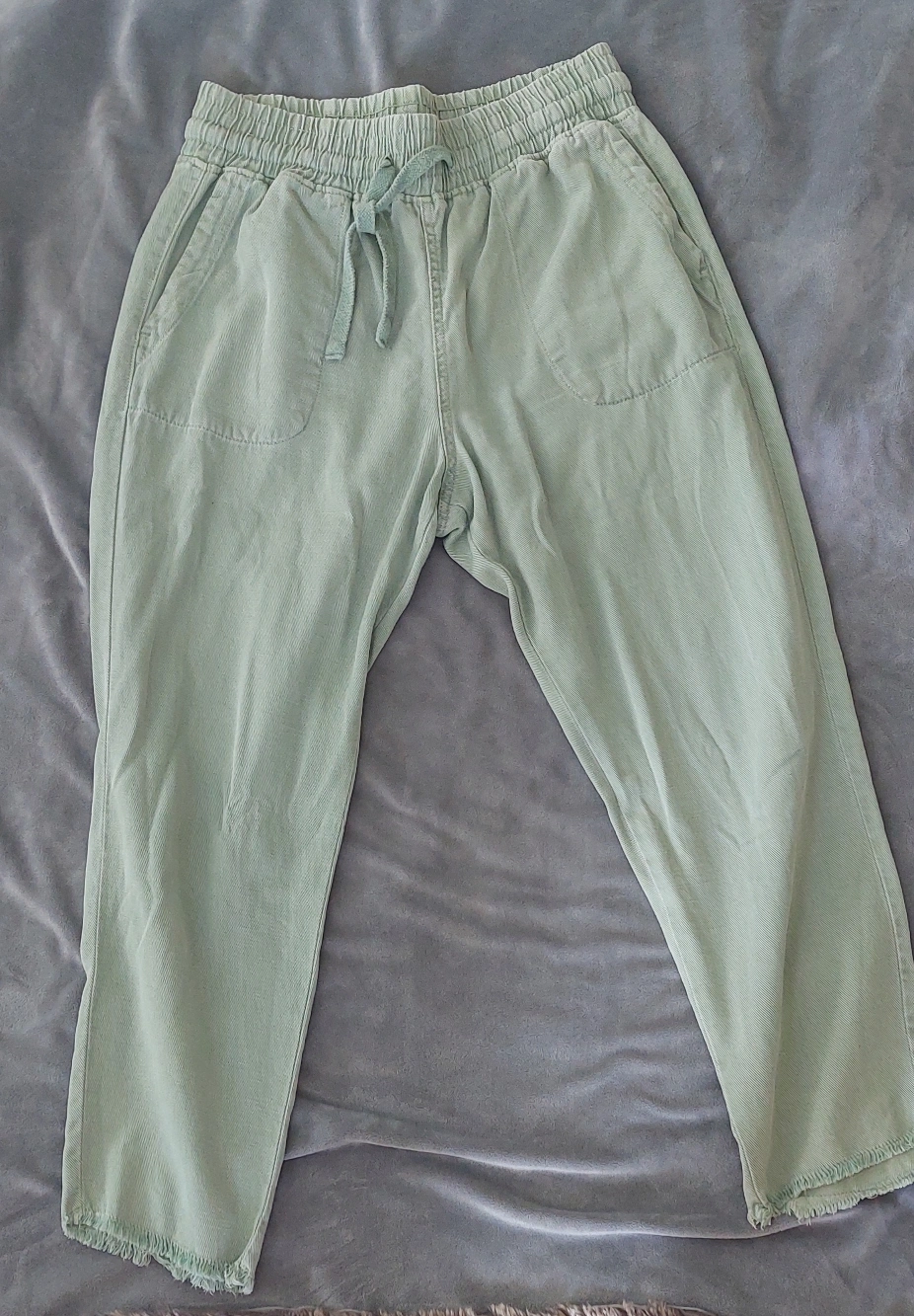 Two pairs of pants, one black and one green. Both are women's size medium. Both have an elastic waistband with a drawstring.