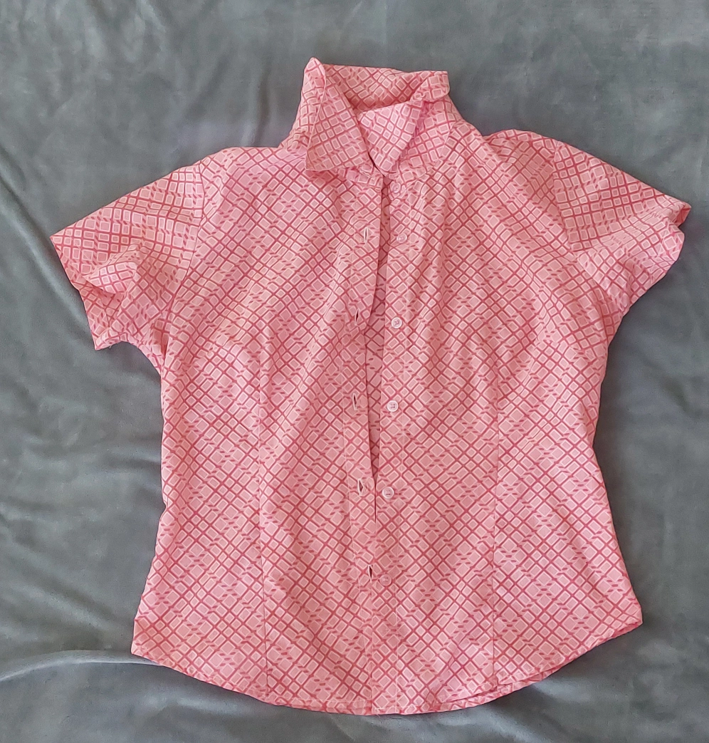 Two pink button-up shirts. One has long sleeves and a striped pattern. The other has short sleeves and a geometric pattern. Both are in good condition.
