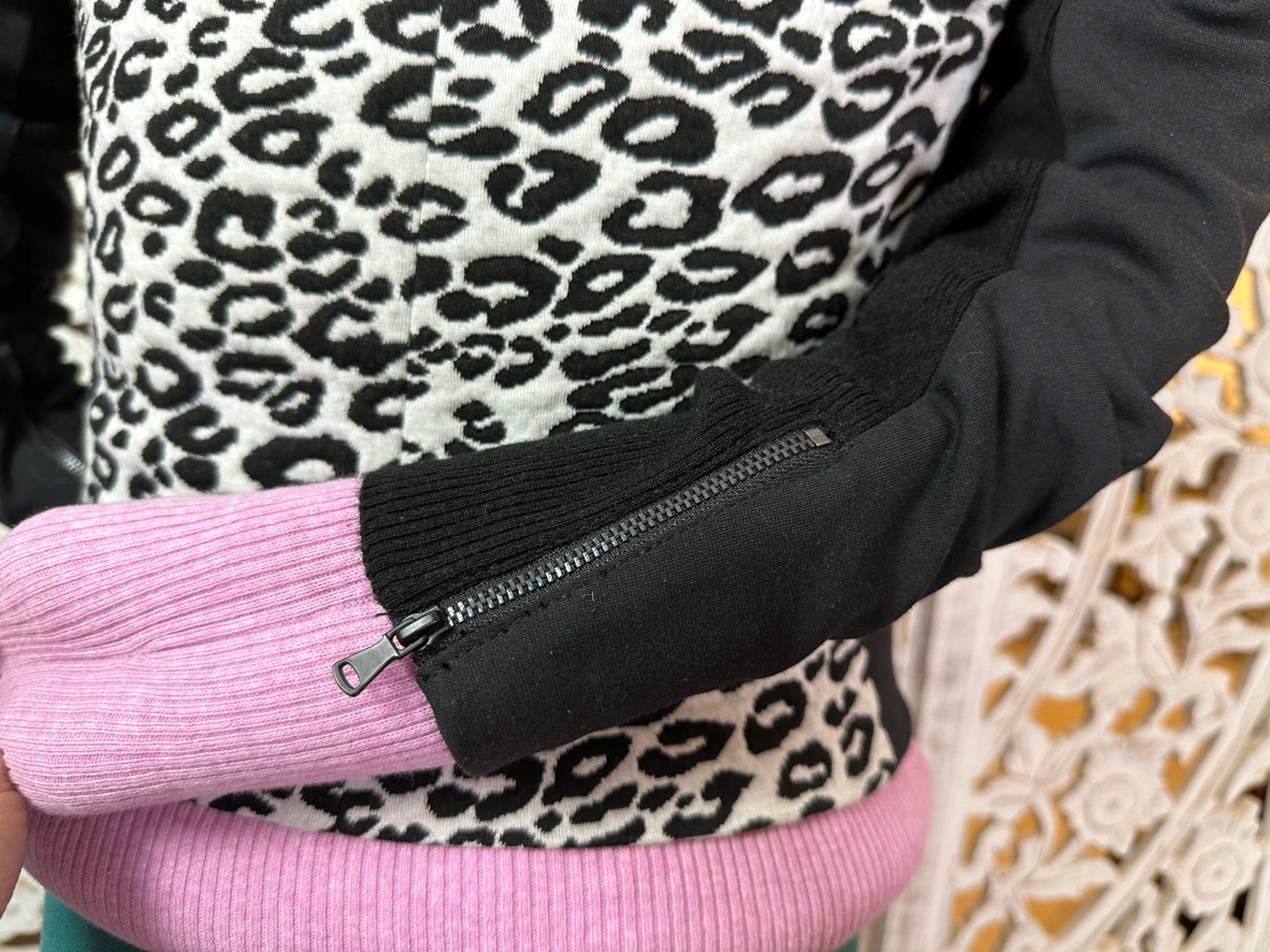 Stylish monochrome leopard print with black accents on the collar, sleeves, and side panels