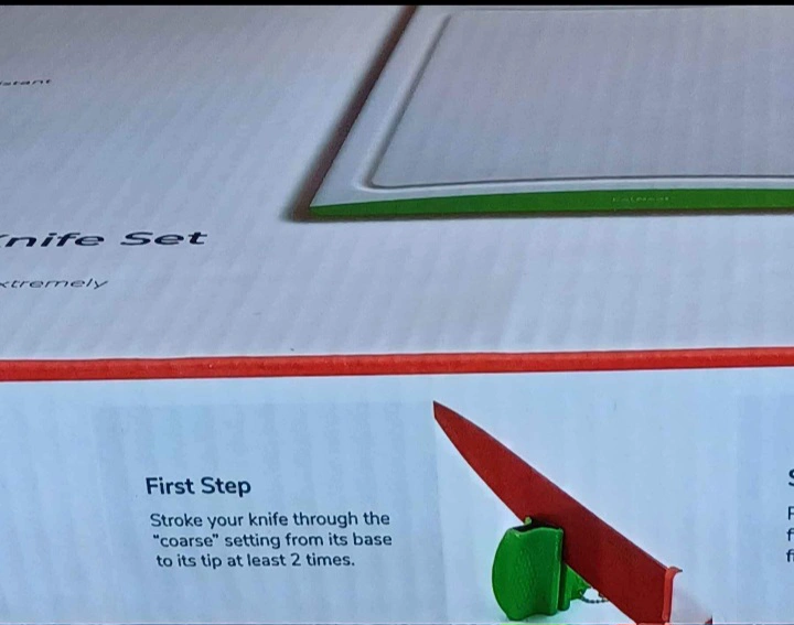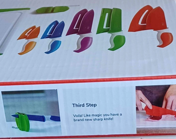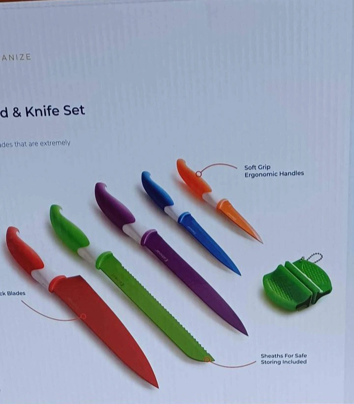 12 piece set includes 5 assorted kitchen knives, 5 matching knife sheaths, 1 non-slip cutting board, and 1 knife sharpener. Durable stainless steel blades that are extremely sharp and stain resistant.