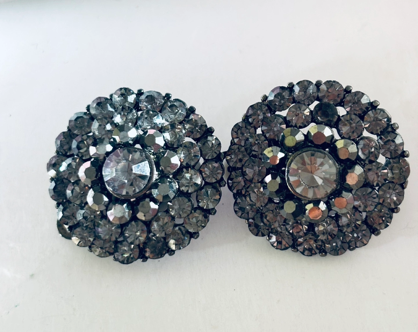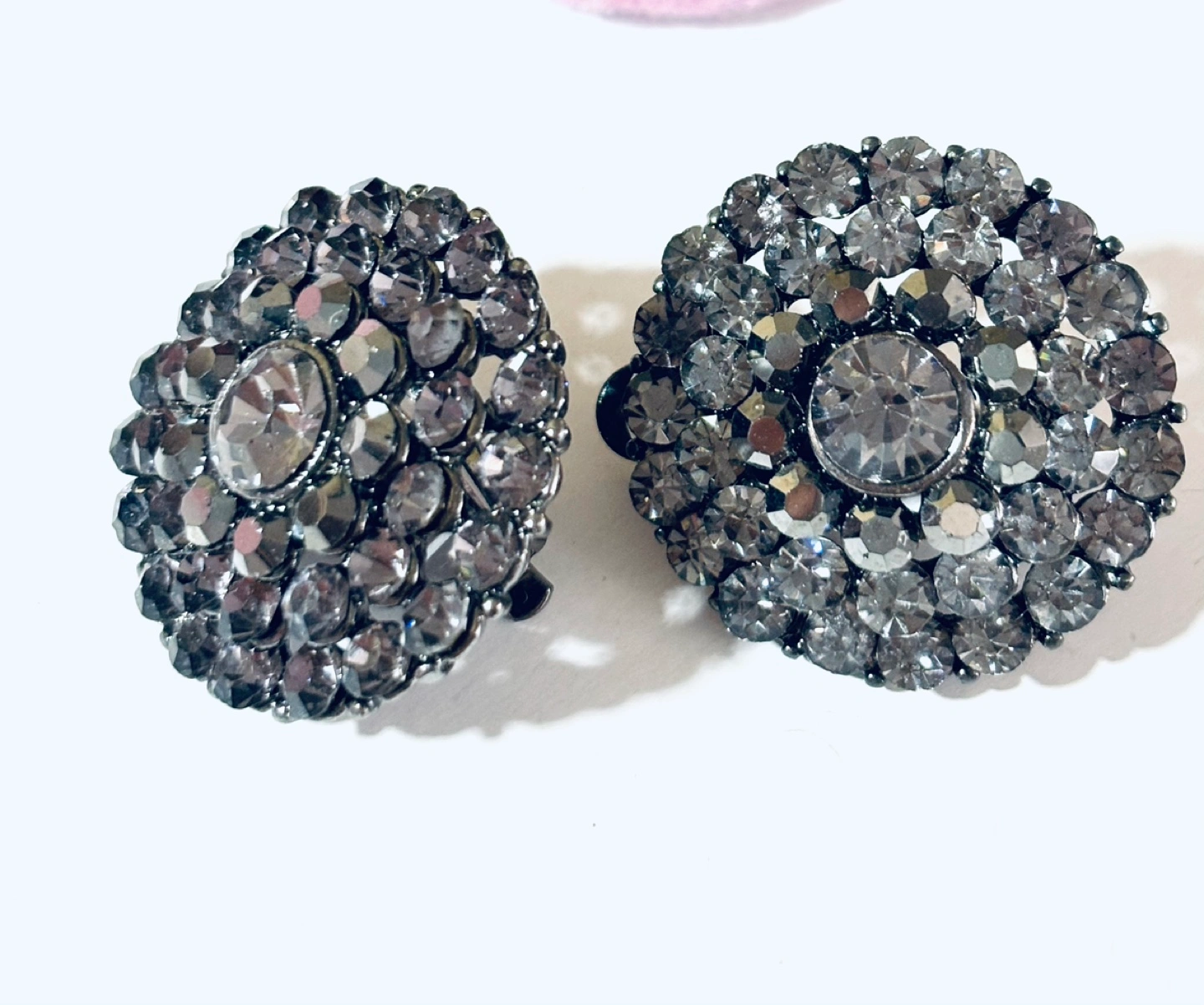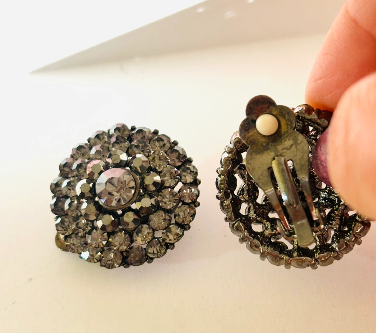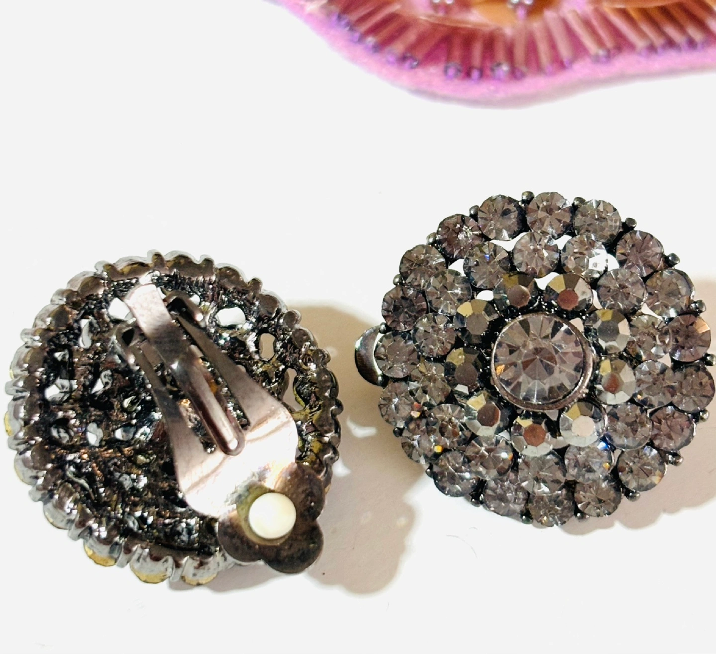 Round clip-on earrings with rhinestones. Silver tone metal.