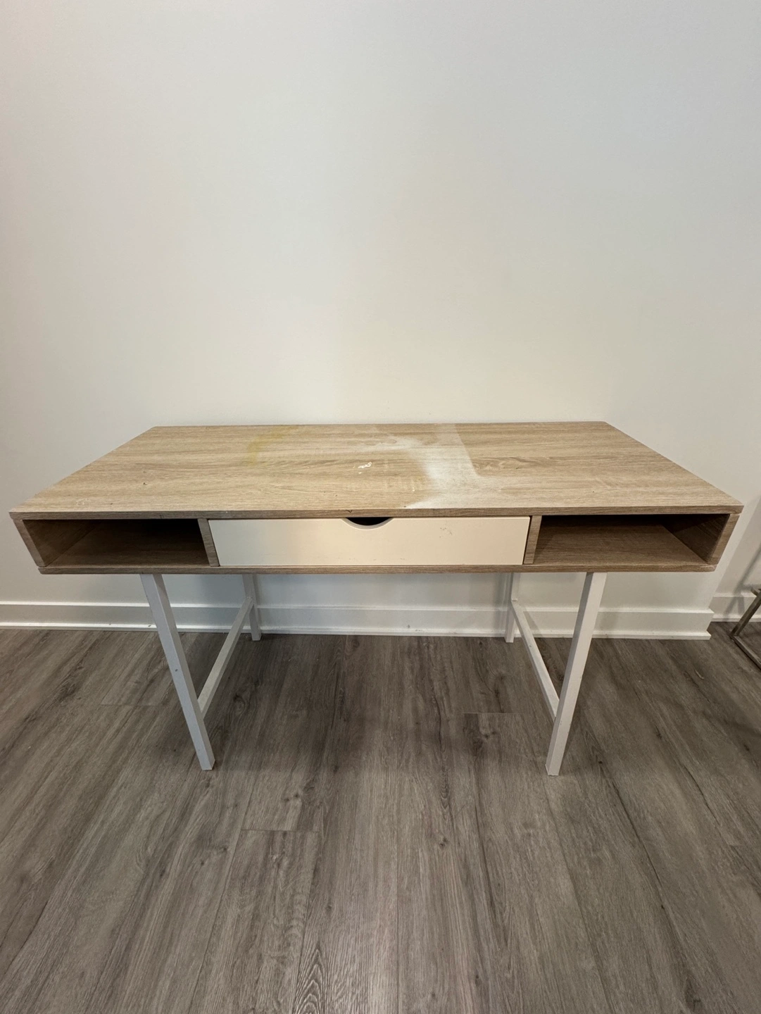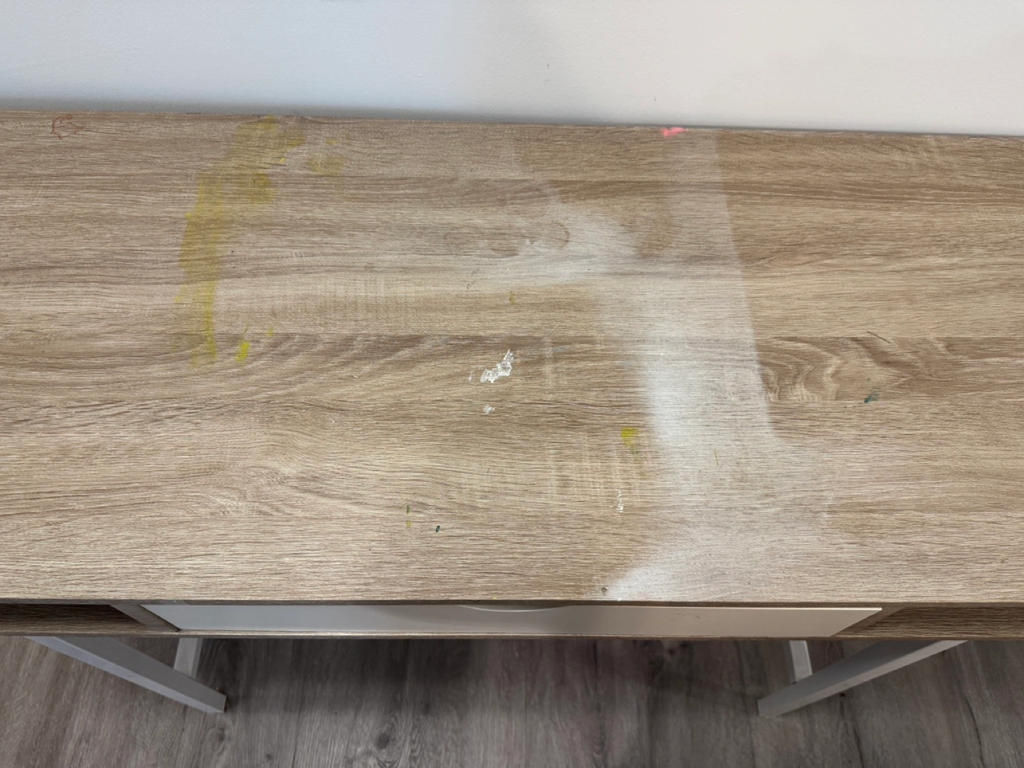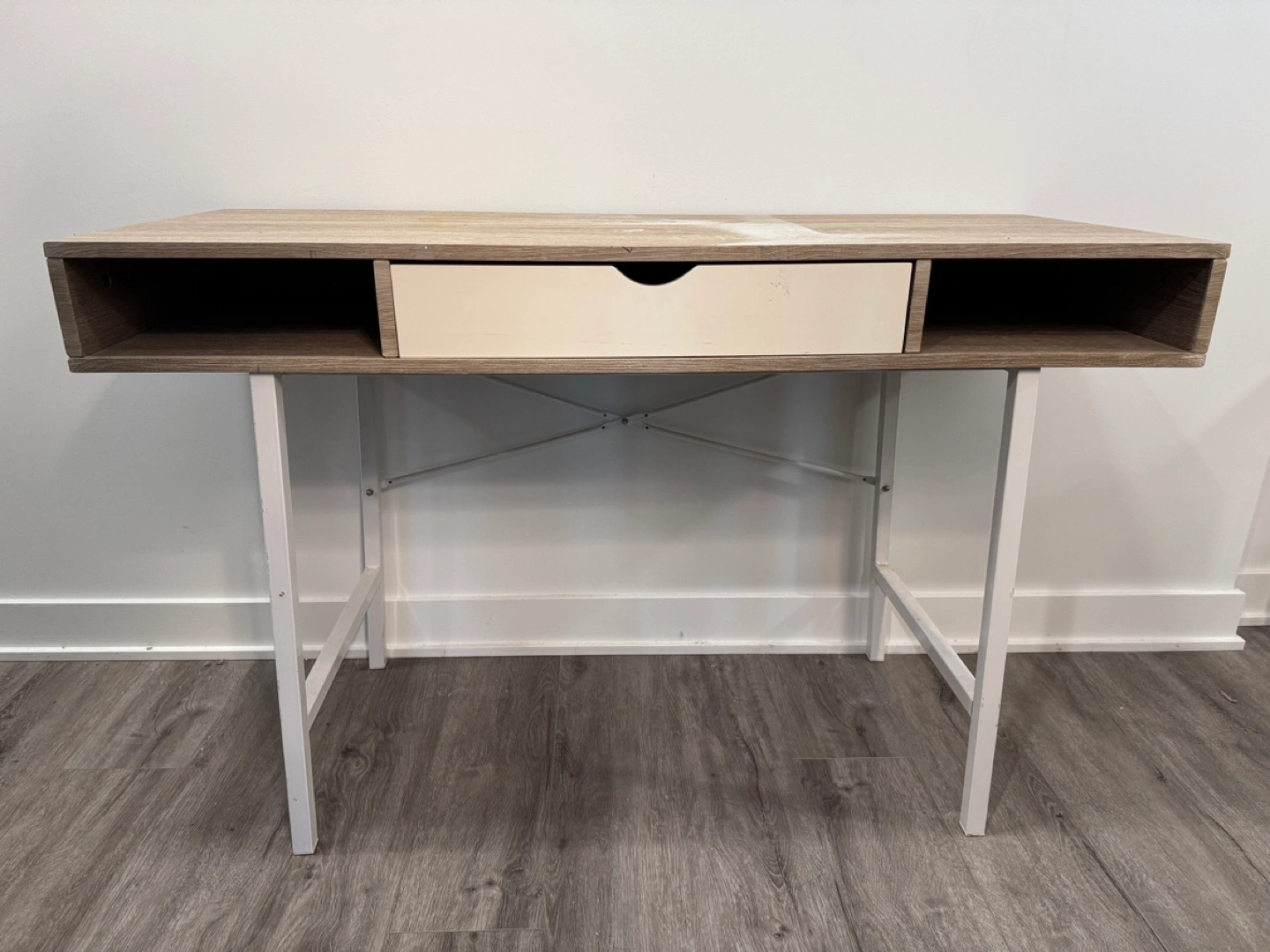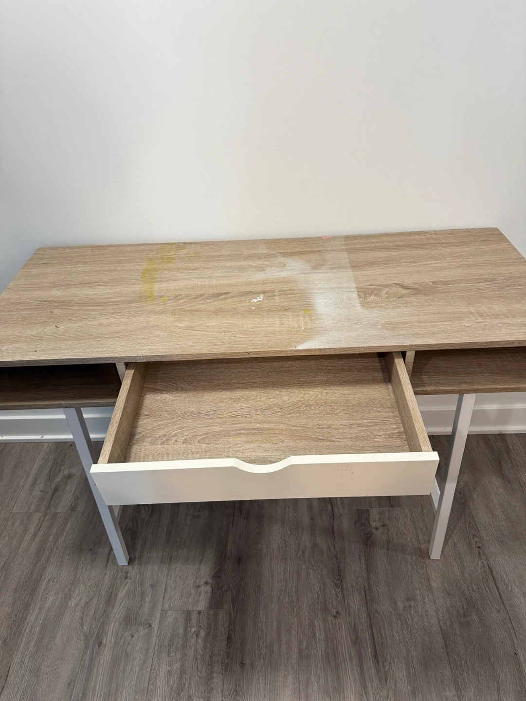 Selling a beige and white desk previously used for arts & crafts. Note the paint marks on the top. Pick-up only :)
