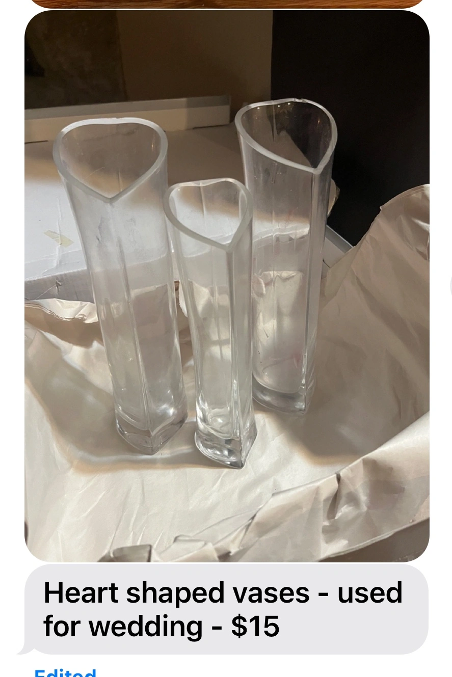 2) Three clear heart shaped glass vases used for wedding, various sizes. $15