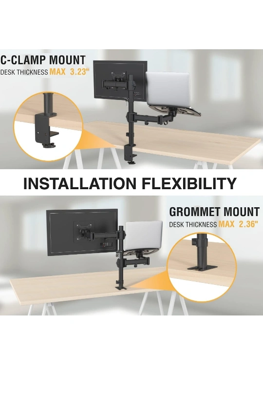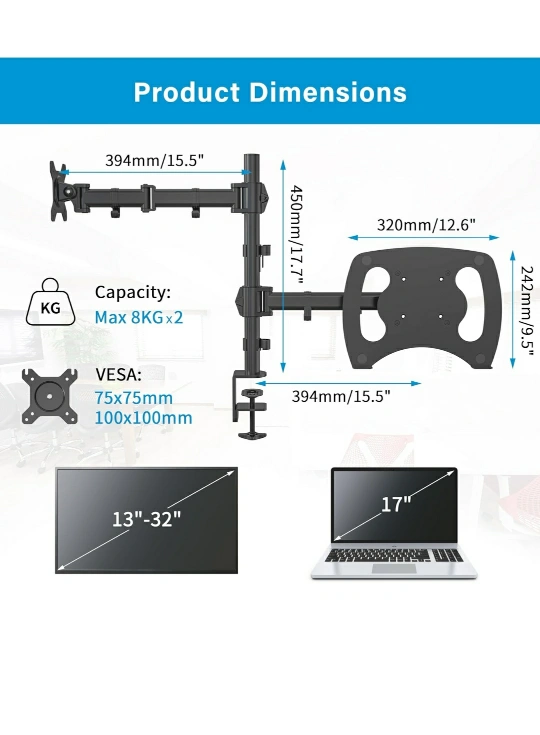 Holds 13"-32" monitor & 12"-17" laptop, 17.6lb per arm, VESA, tilt, swivel, cable management, C-clamp or grommet mount, easy install