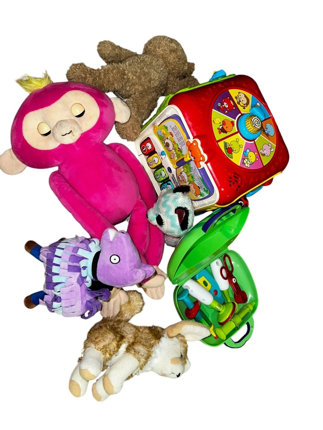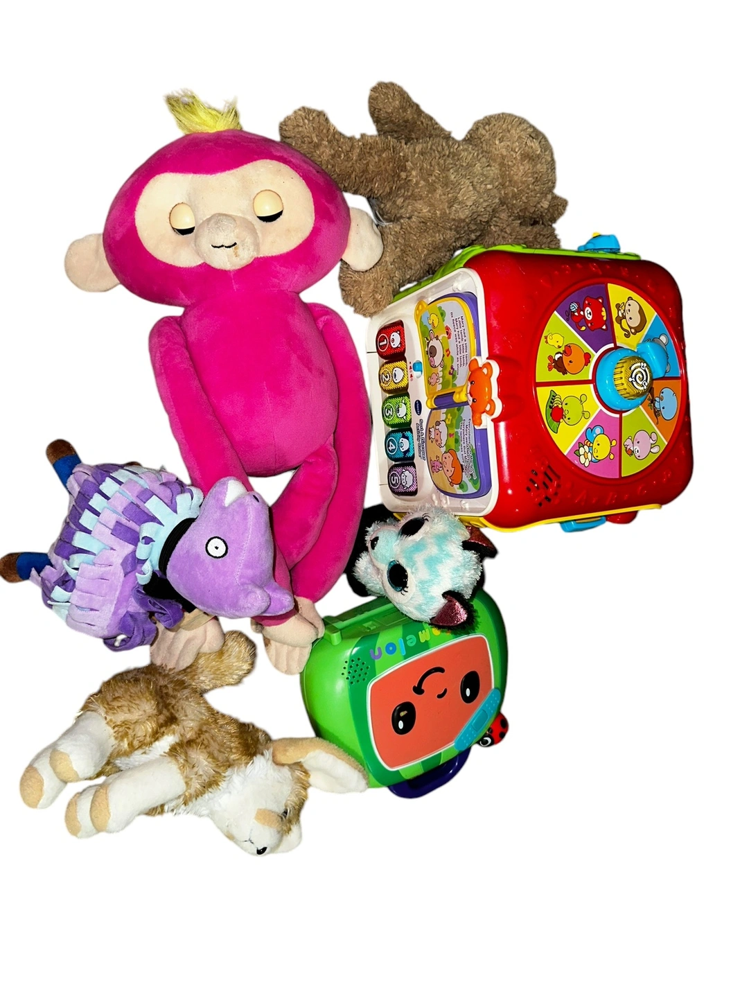 Assortment of stuffed animals and toys, including a pink monkey, brown bear, purple unicorn, brown deer, and a small blue and white plush. Also included are two electronic toys, one red and one green.