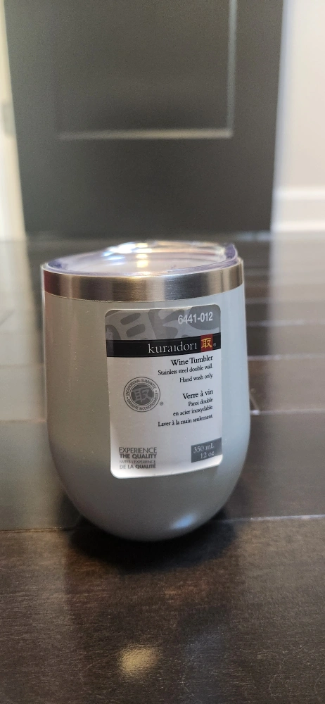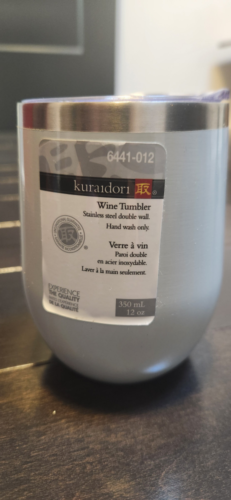 Selling a Kuradori wine tumbler, crafted with double-walled stainless steel to keep your drink perfectly chilled. This sleek and modern tumbler has a 12 oz (350 mL) capacity and is designed with durability in mind. It's brand new, never used, and includes a secure lid for spill-free enjoyment.