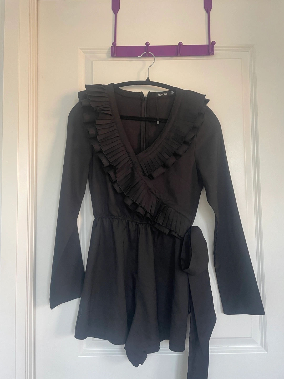 Black jumpsuit with long sleeves, a V-neck, and a tie at the waist. Pleated detail around the neckline. Size US 4 / small. Perfect for going out!