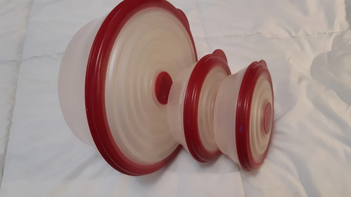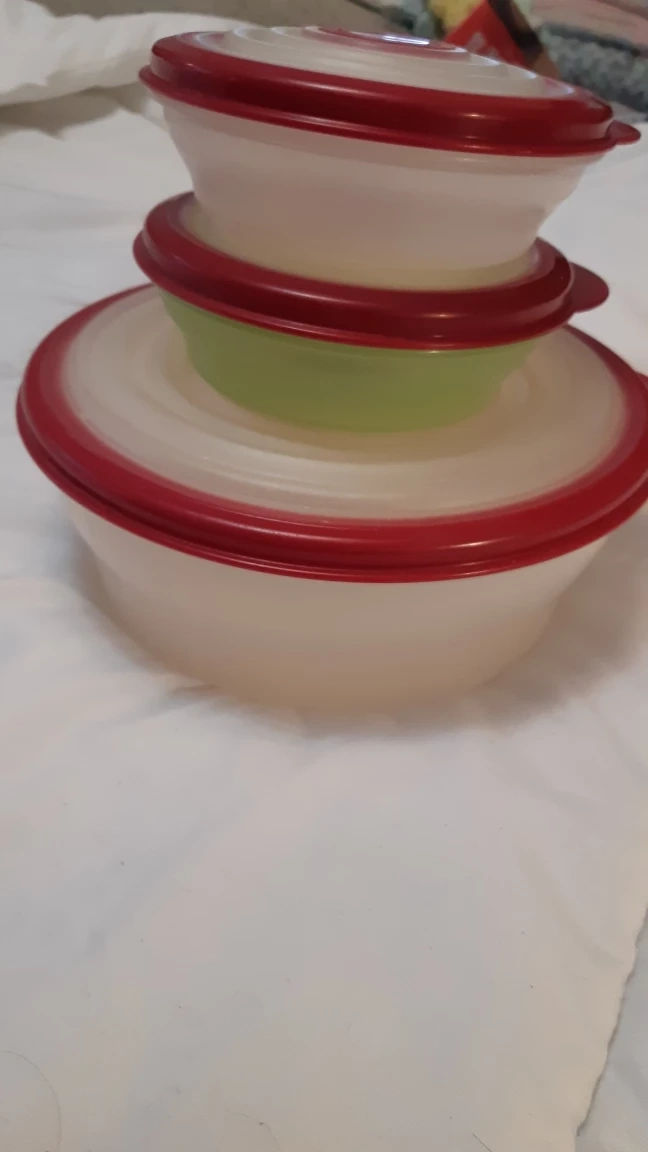 Three piece set of clear Tupperware bowls with red and lids. Perfect for storing leftovers or bringing lunch to work.