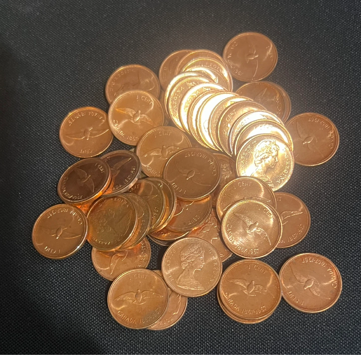 A collection of Canadian 1 cent coins. coins display the years 1867-1967. These are copper-toned coins featuring a maple leaf and Queen Elizabeth II's effigy.