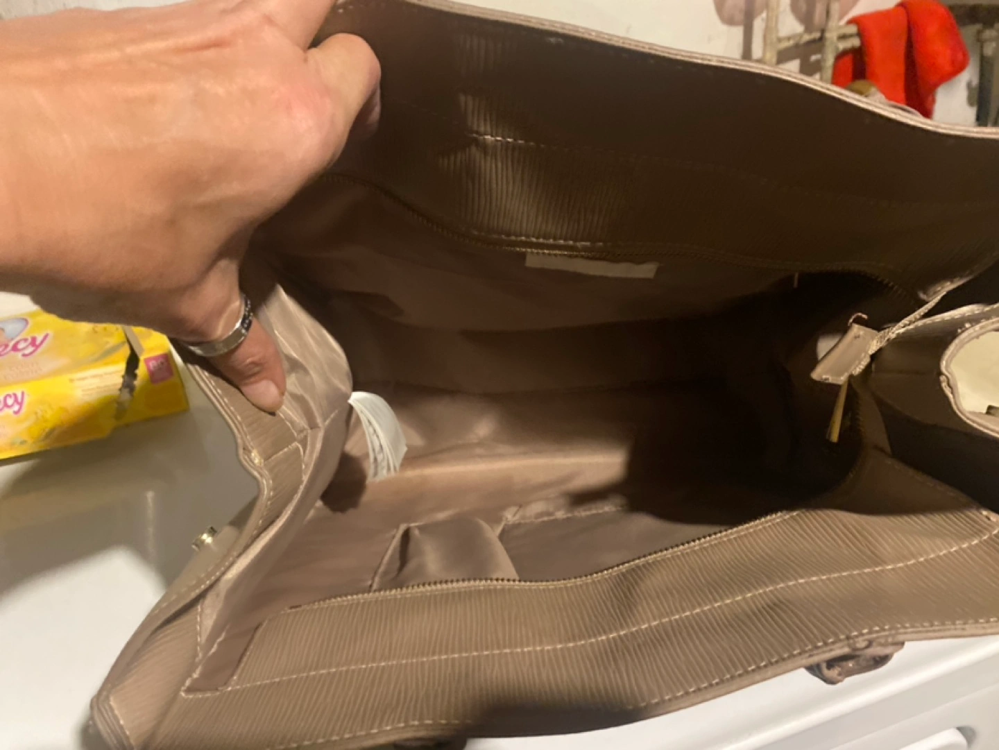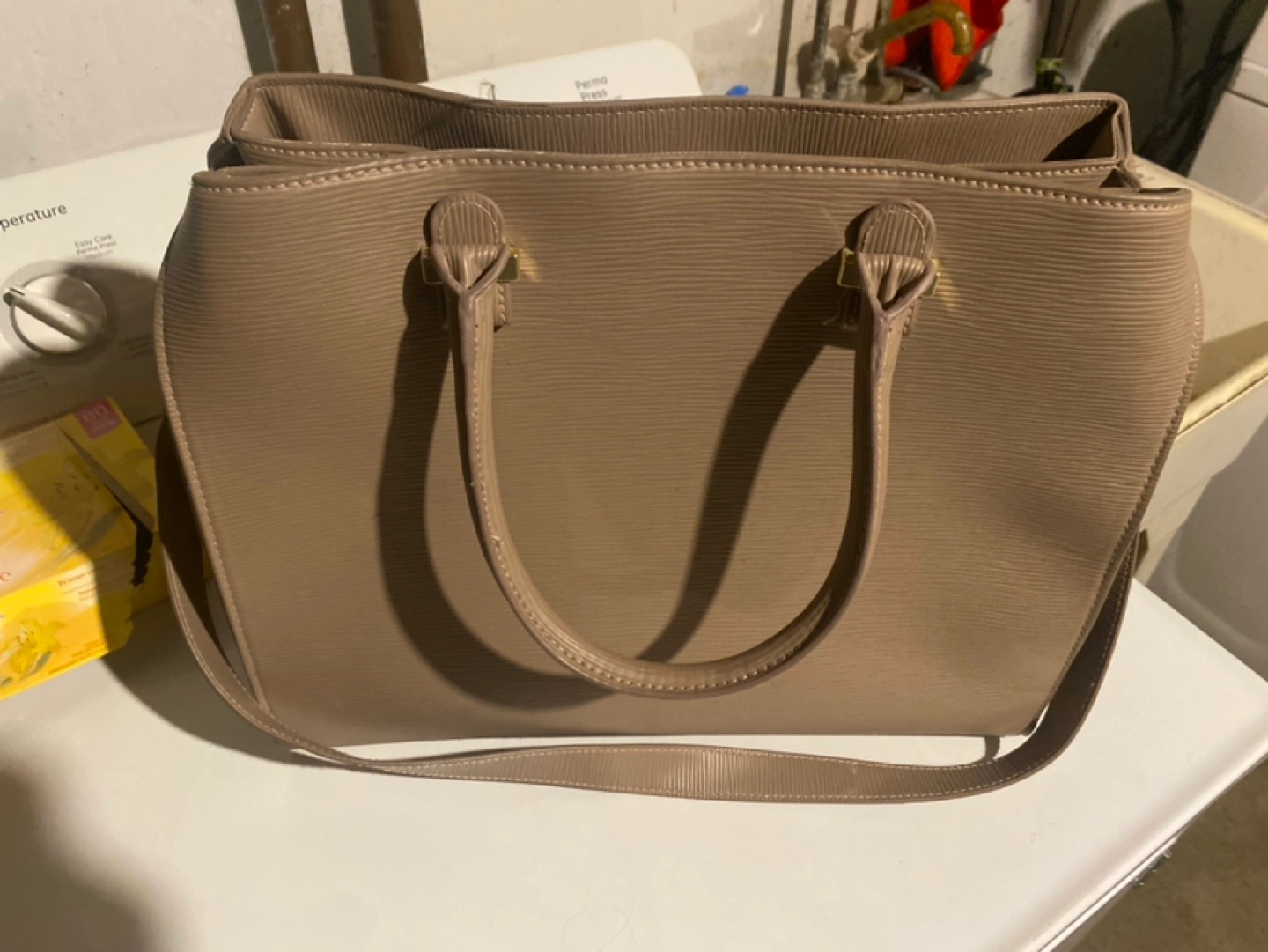 Large, beige handbag with a zipper closure. It has a long shoulder strap, two top handles, and interior pockets. It is in great condition.