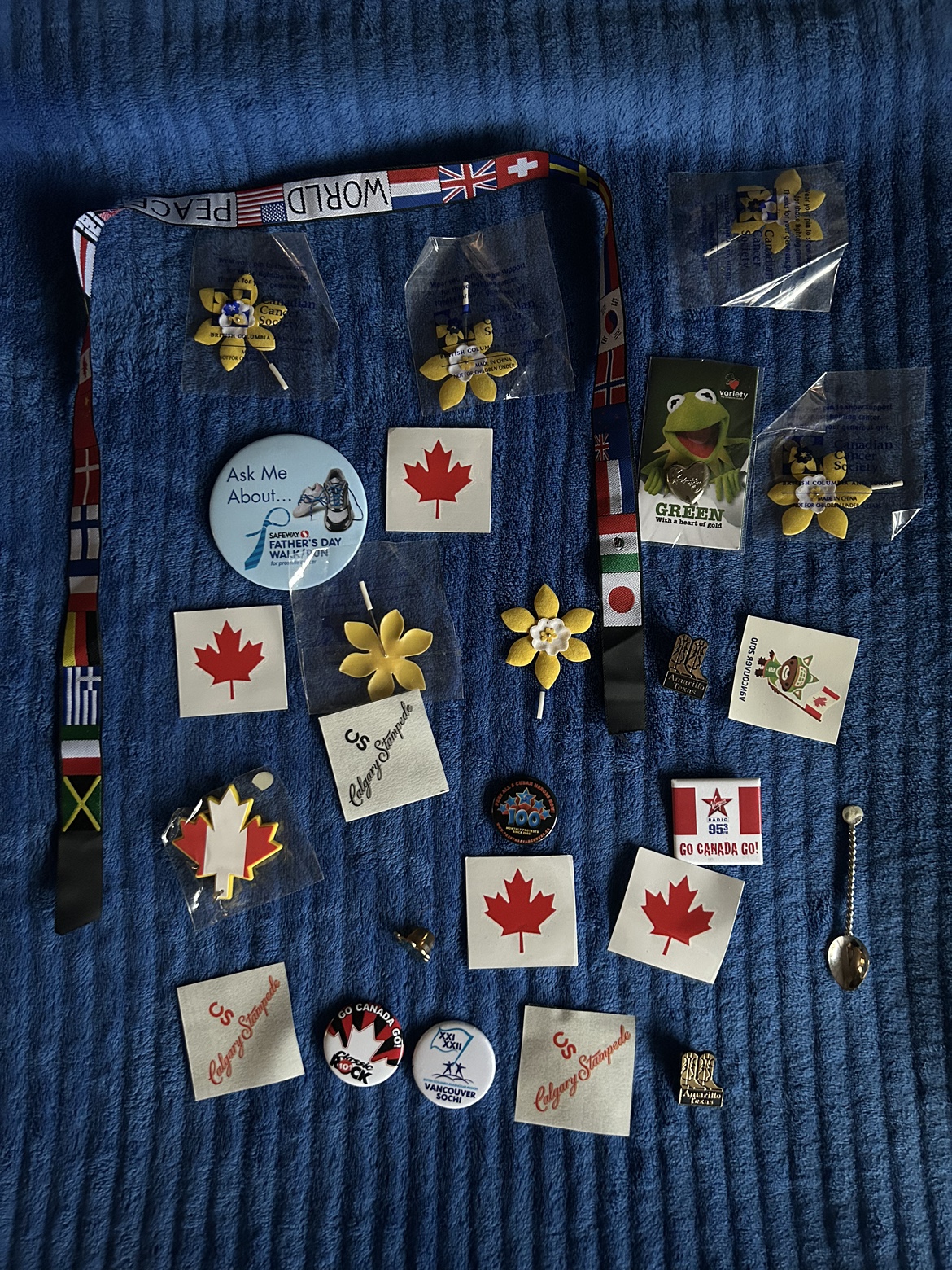 Assortment of Canadian themed collectibles, pins, stickers, and other items. Includes Calgary Stampede and Vancouver 2011 Sochi Olympics.