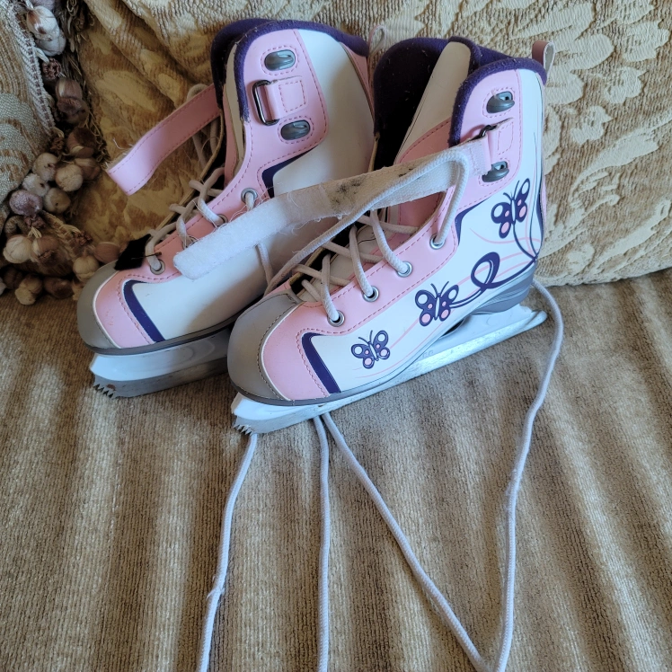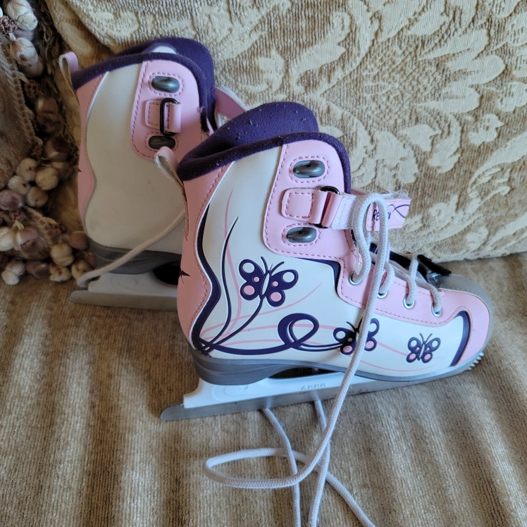 819White ice skates with pink and purple accents. Butterfly design. Size 1.