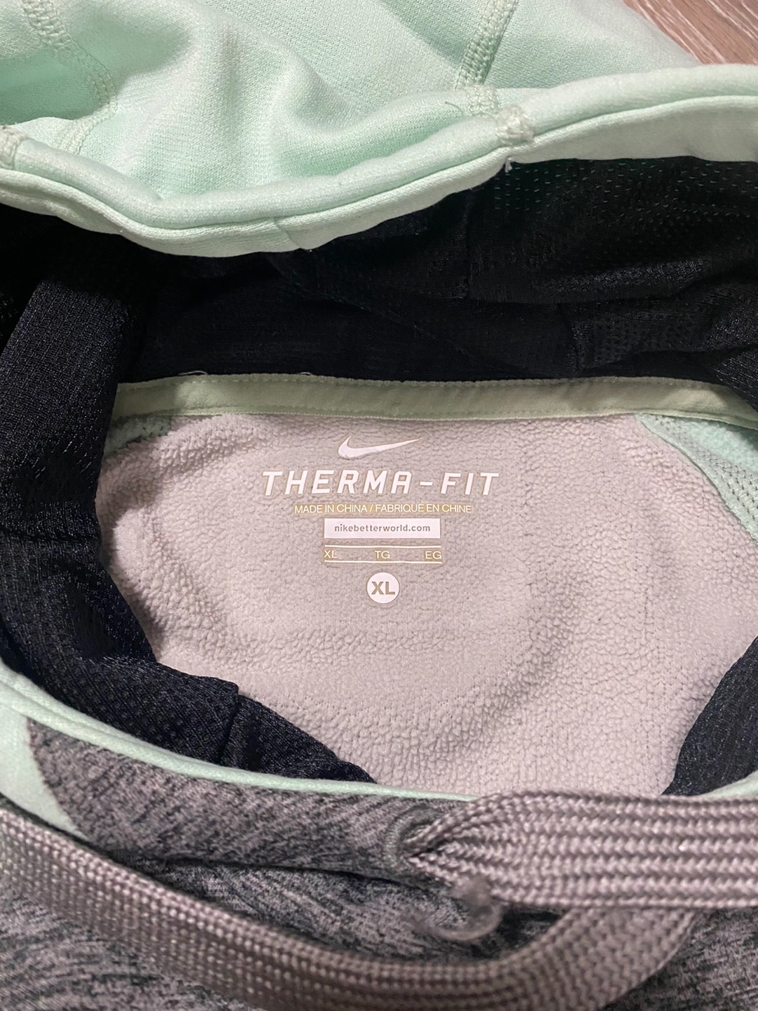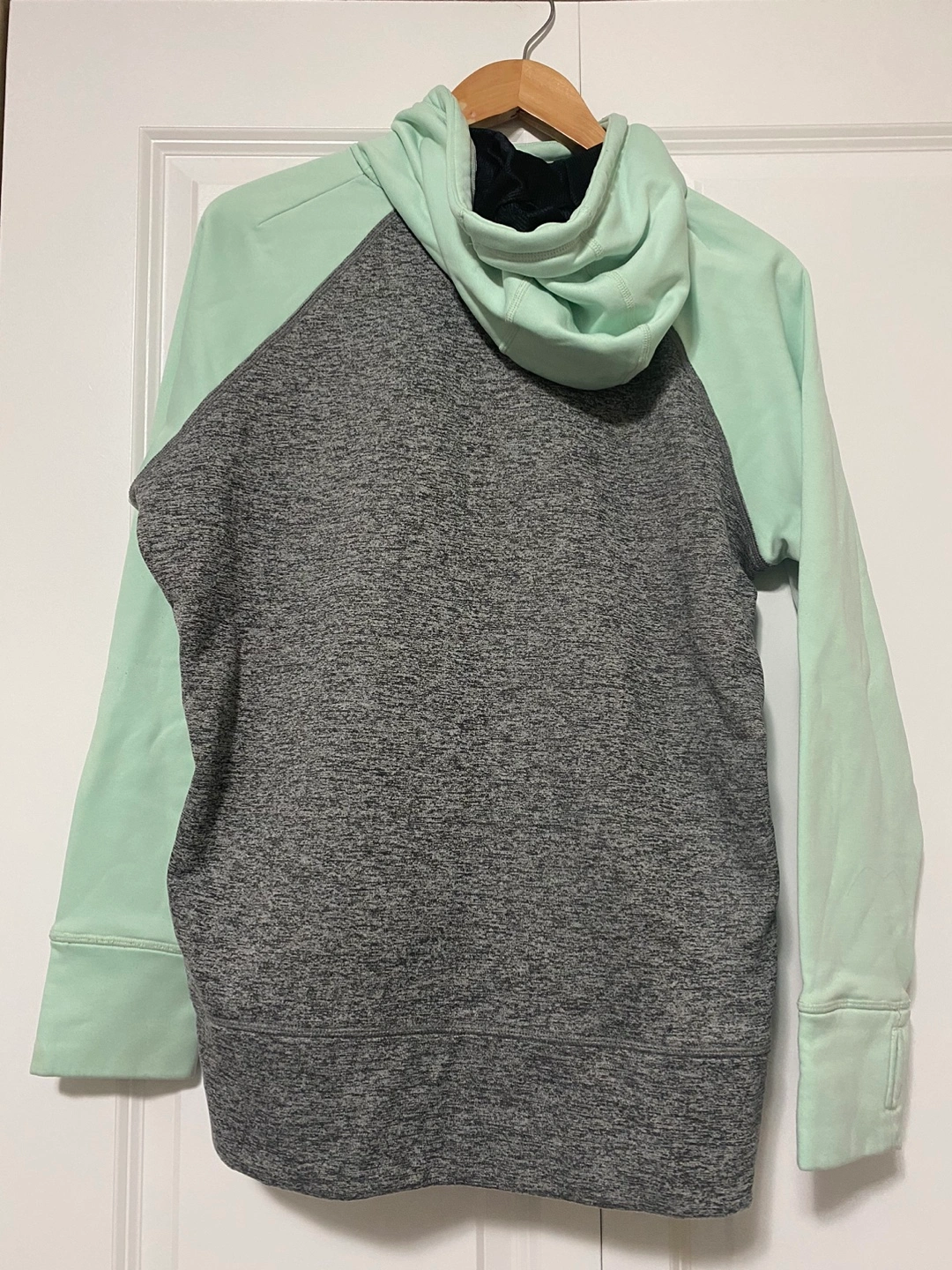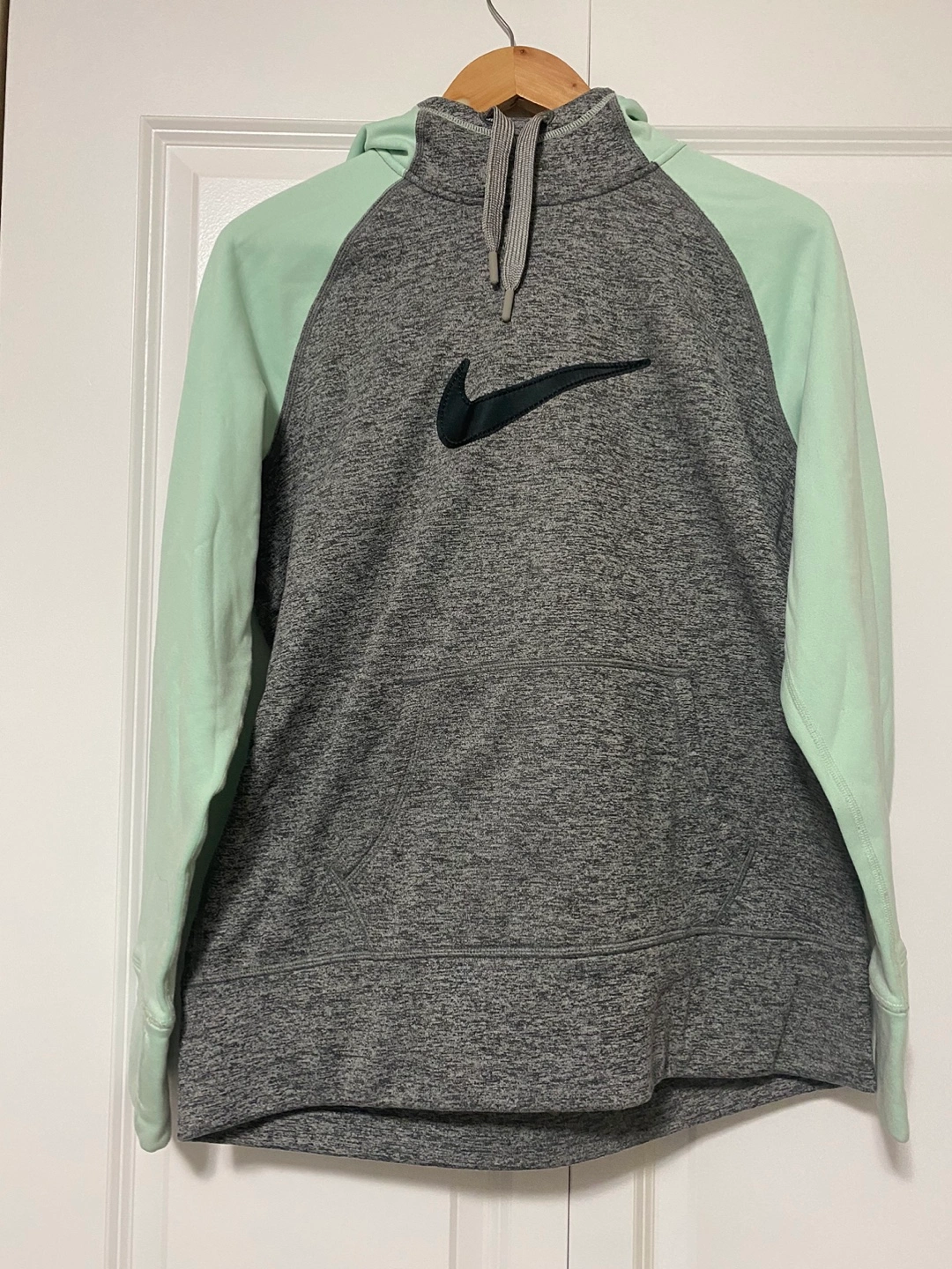 Grey and mint green hoodie with a black swoosh logo. Long sleeves and a hood and thumb holes. Selling because I don't wear it anymore. Perfect for the winter months, very warm.